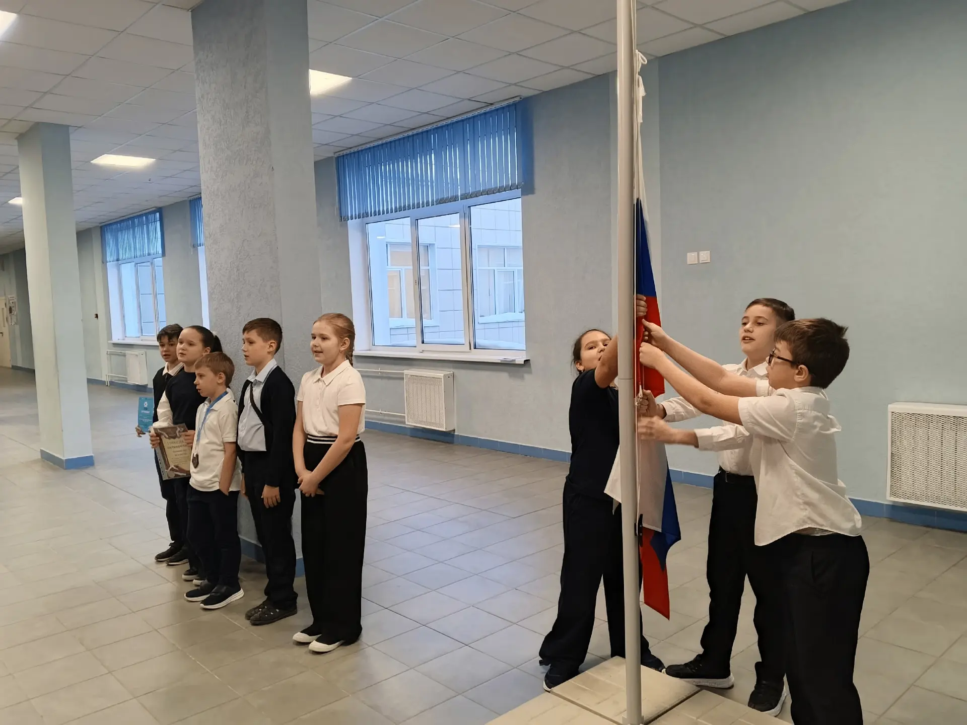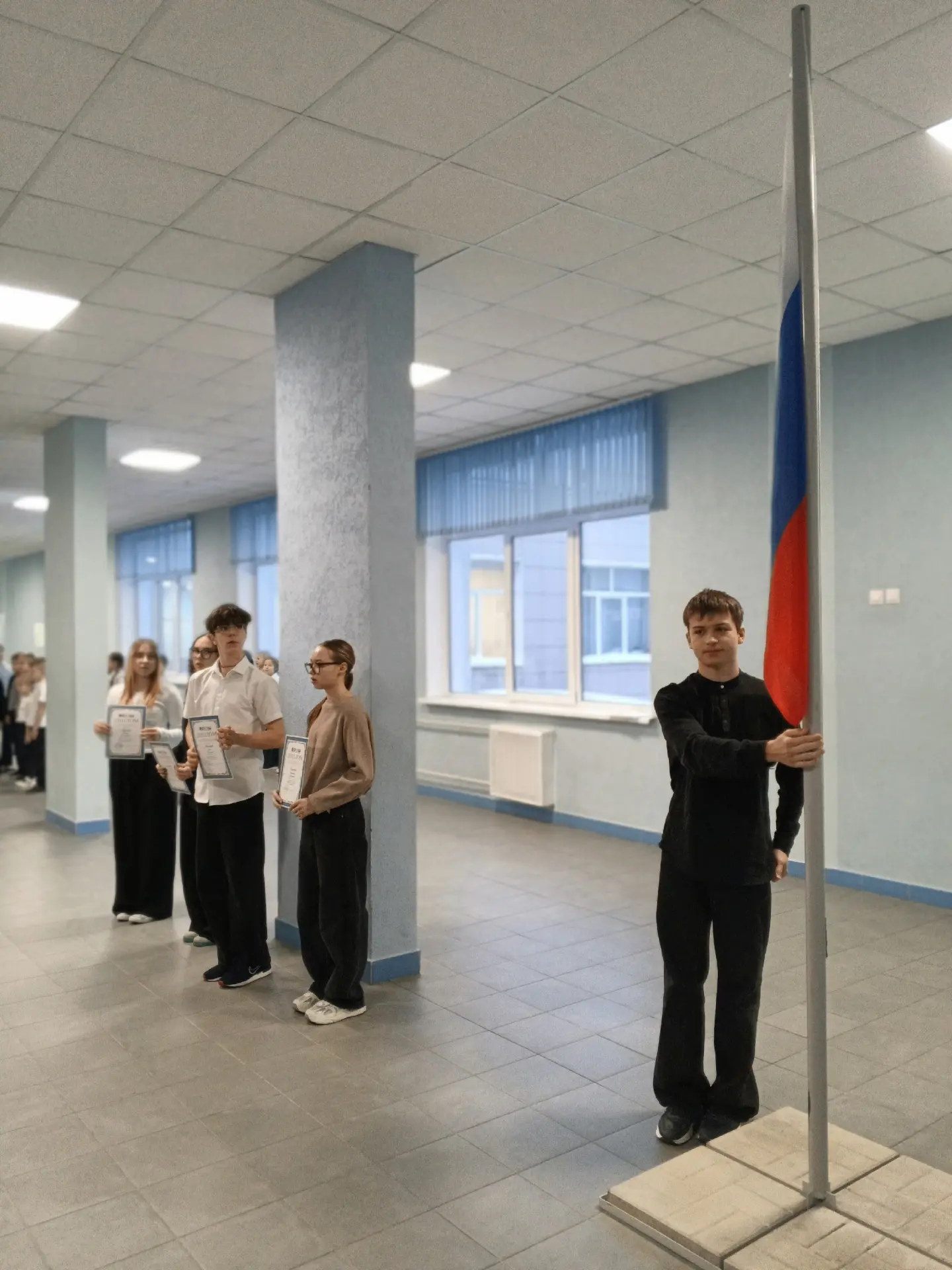 Утро понедельника для 1-11 классов началось с линейки поднятия флага Российской Федерации и исполнения Гимна.