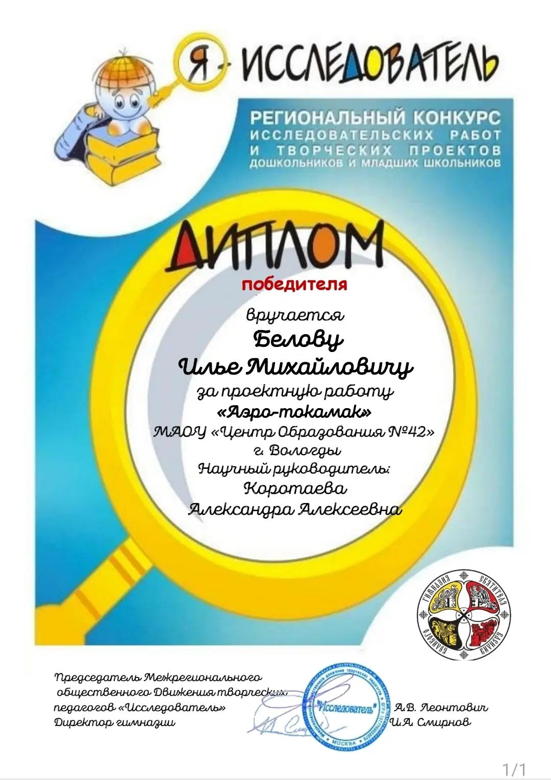 Среди победителей ученик 4 "З" класса Центра образования Белов Илья с проектной работой "Аэро-токамак". Научный руководитель - Александра Алексеевна Коротаева.