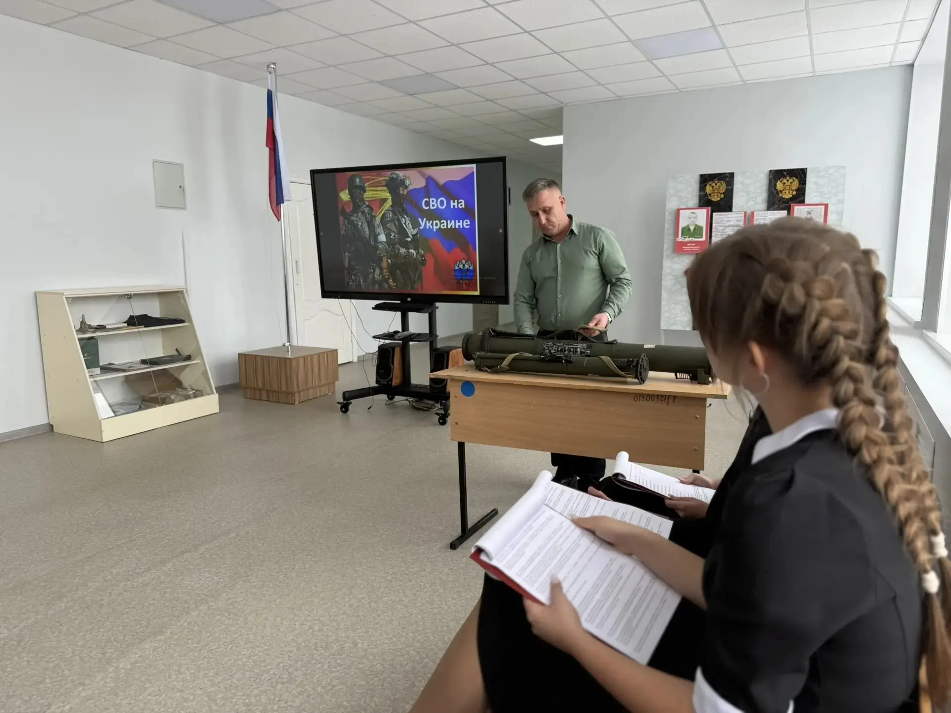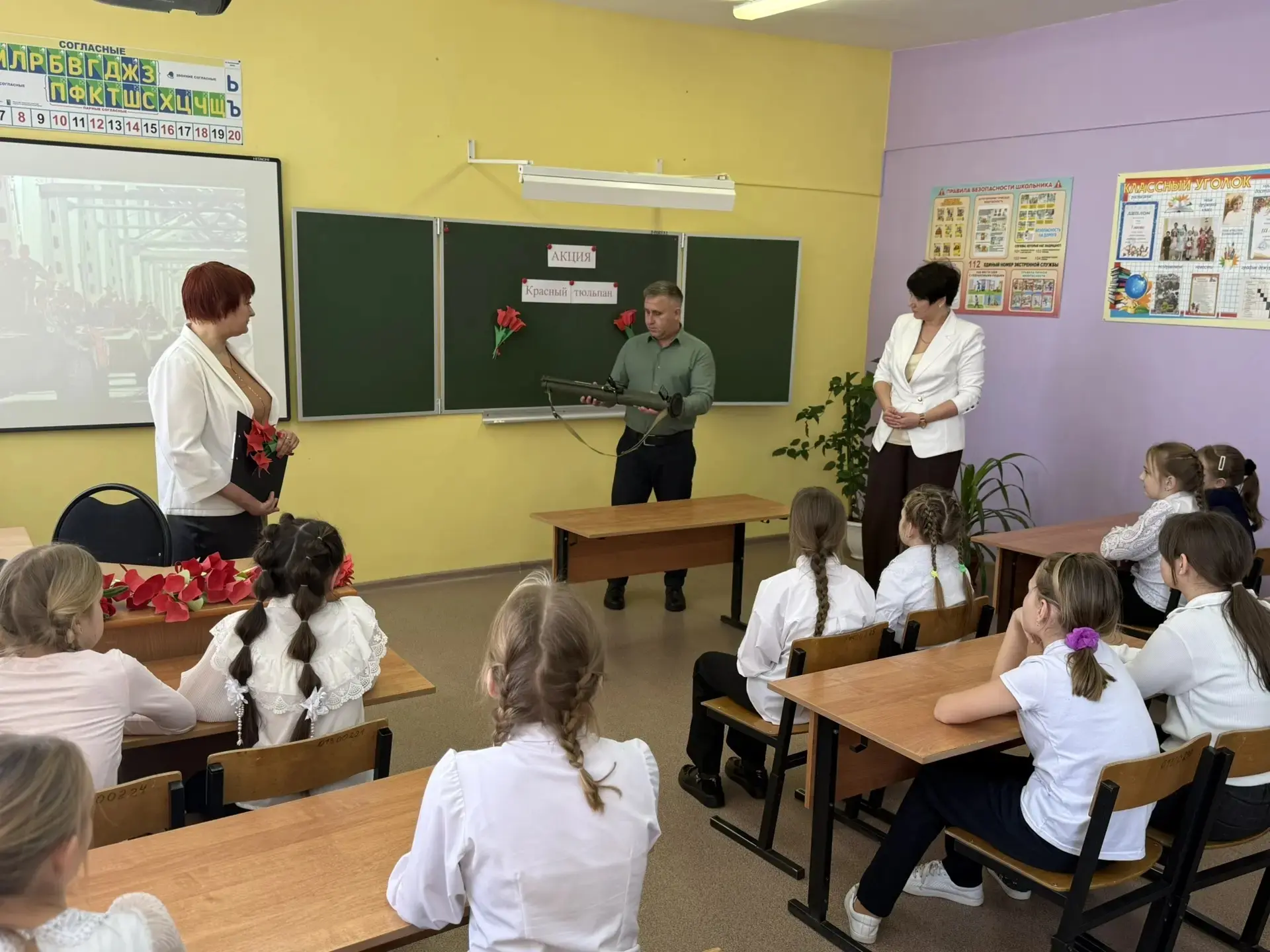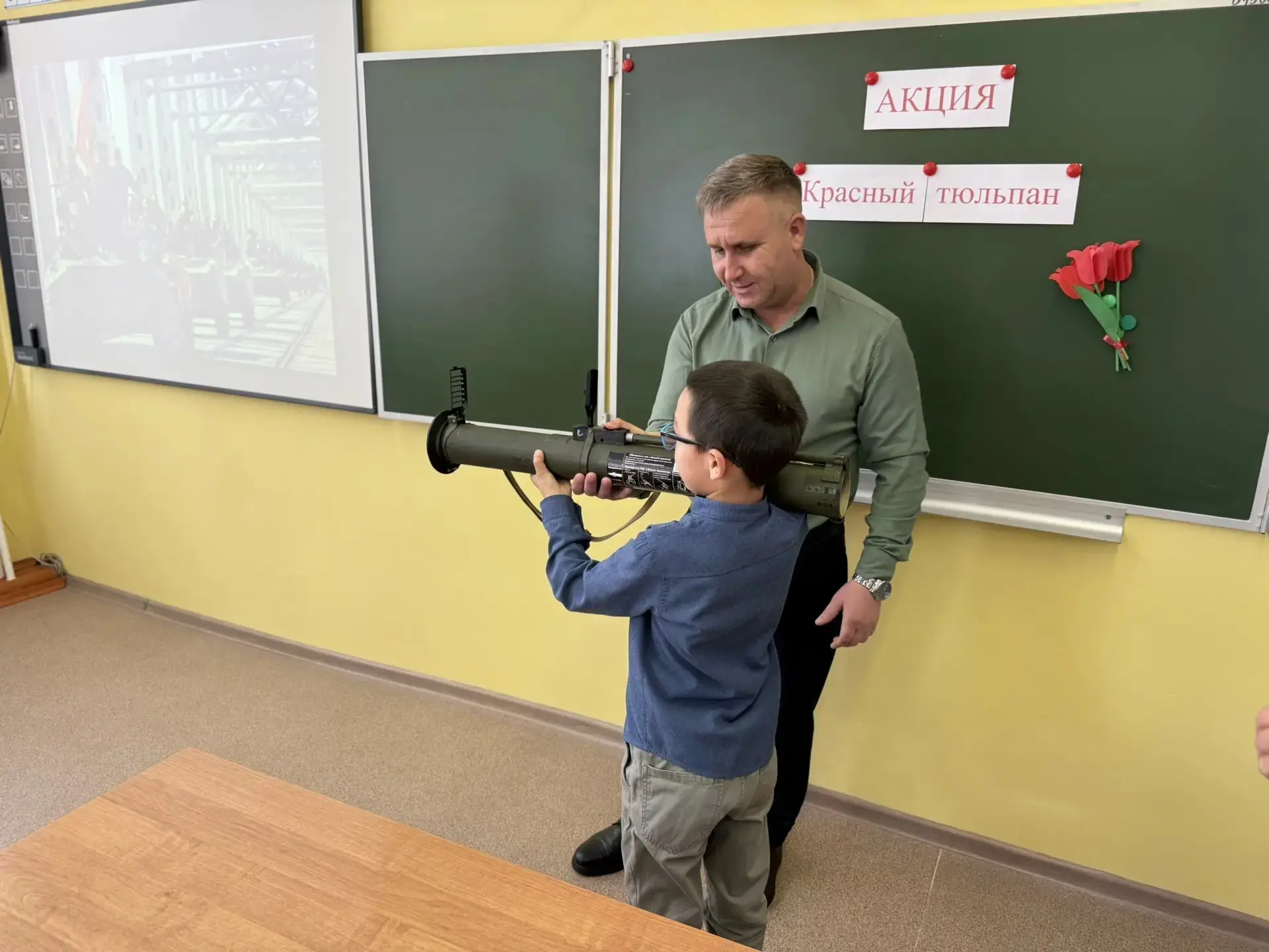 На мероприятии присутствовал почётный гость - глава Подгоренского сельского поселения, волонтёр СВО, Разборский А.С., который рассказал ребятам о своей волонтёрской деятельности и подарил в качестве экспоната в школьный Зал боевой славы РШГ (без боевого заряда), привезённый им из зоны СВО.