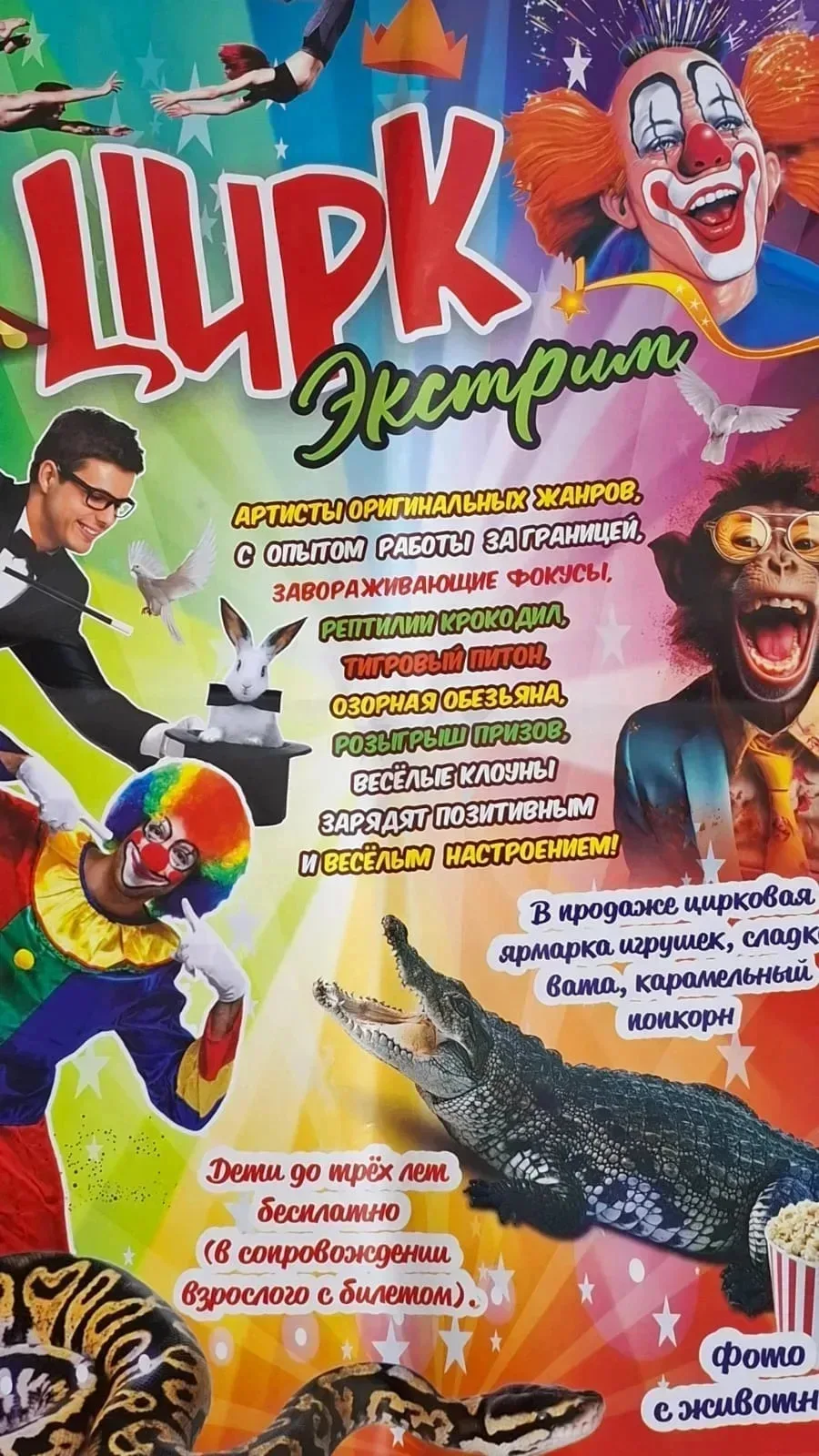 Интерактивное Цирковое Шоу «ЭКСТРИМ»! Артисты оригинальных жанров, лауреаты фестивалей циркового искусства, завораживающие фокусы и иллюзия, танцующий розовый слон Джони, зажигательная обезьяна эквилибрист Бади, огромный 4-х метровый индийский питон, нильский крокодил, Енот Полоскун...