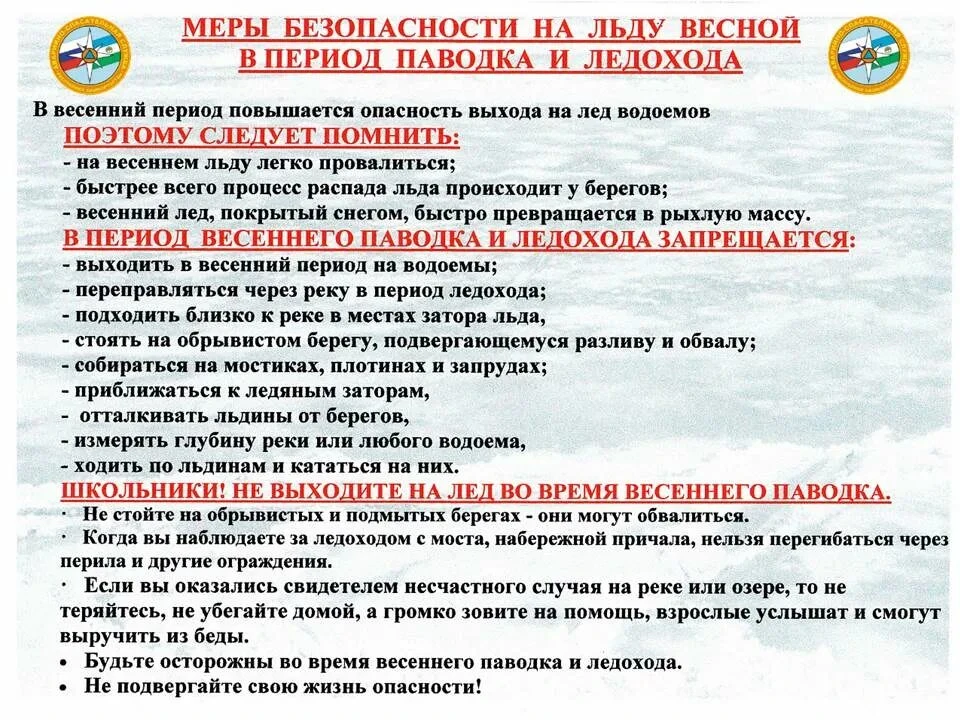 Не выходить на лёд во время весеннего паводка — в этот период лёд на водоёмах становится рыхлым и непрочным, и передвижение по нему может привести к провалу в воду.