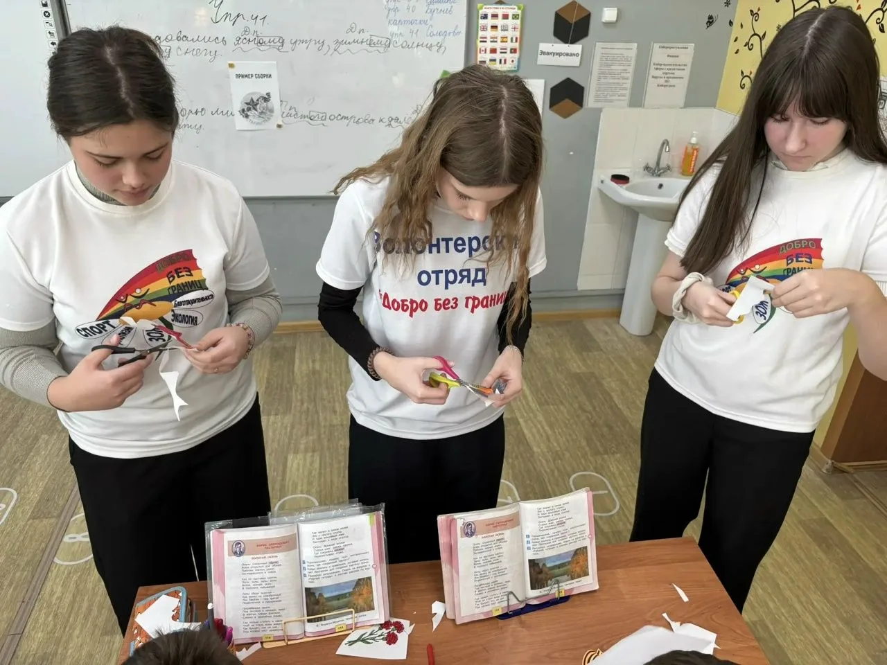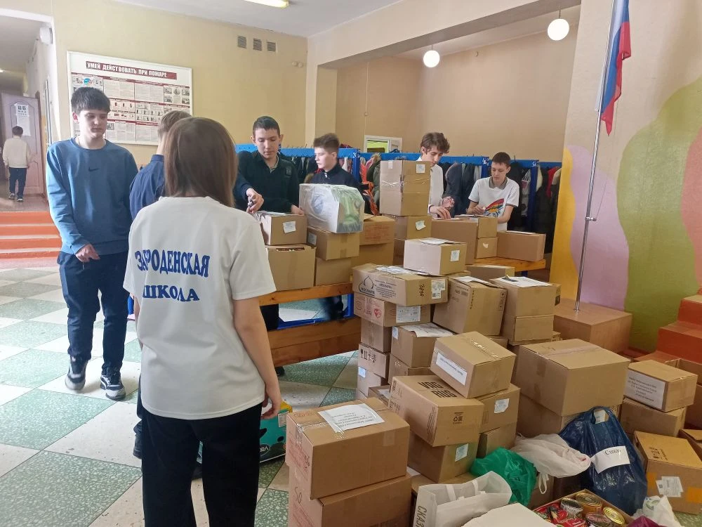 Волонтеры отряда «Добро без границ» совместно с советником директора по вопросам воспитания Краснощековой Е. И. под лозунгом «Своих Не Бросаем» организовали упаковку и погрузку продуктов питания, предметов личной гигиены в предоставленный семьёй волонтеров Калачеевского района Шевыревых автомобиль.