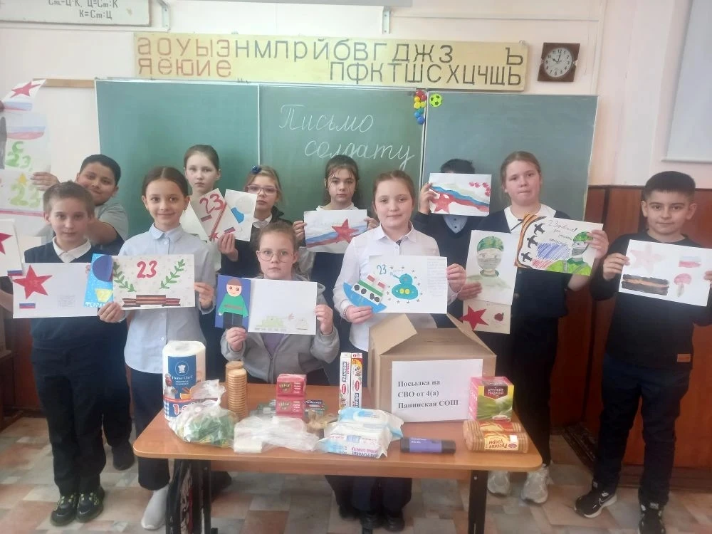 Ученики 4 "а " класса подготовили письма, рисунки и поделки для участников СВО и посылку с предметами личной гигиены и сладостями.