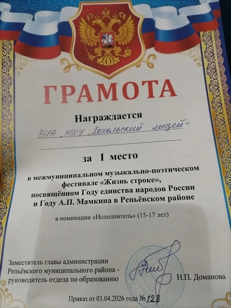 Отличный результат и заслуженная победа! 3 апреля участники ВИА Хохольского лицея заняли первое место на музыкально-поэтическом фестивале «Жизнь строке» в Репьёвском районе.