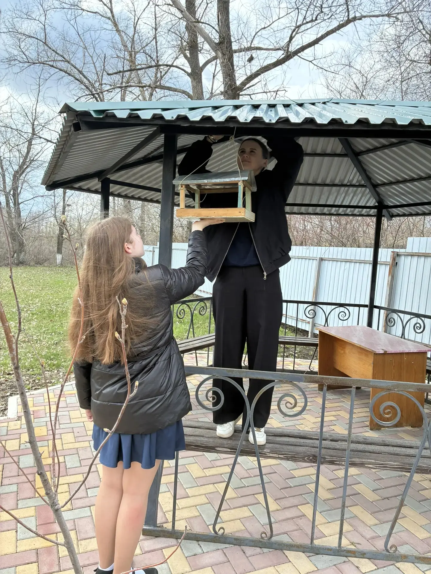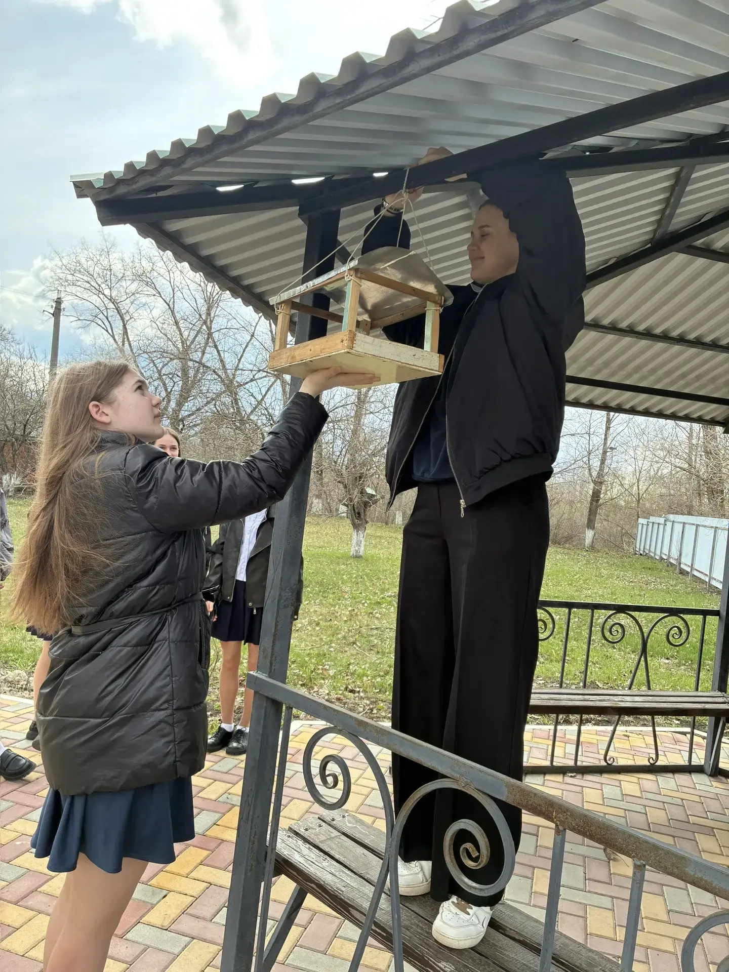 В рамках предметной недели по биологии учащиеся 8В класса с целью изучения поведения птиц, из видового определения установили в беседке кормушку с кормом.