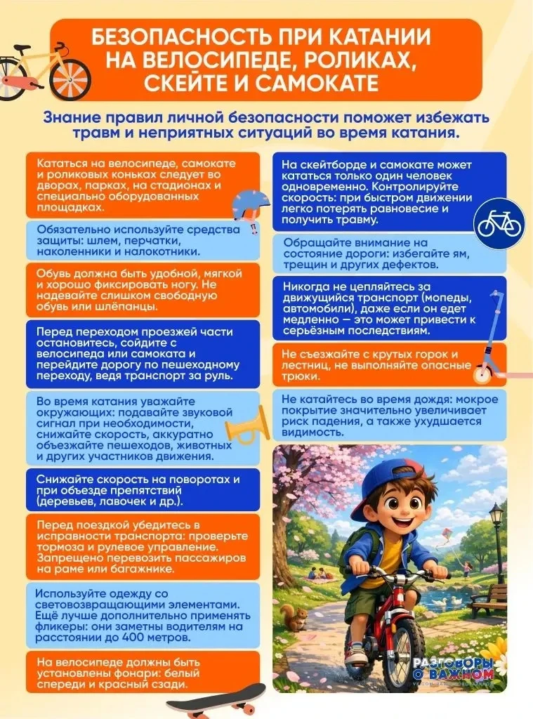 📍Делимся с учащимися и их родителями памяткой о правилах безопасности при катании на велосипеде, роликах, скейтборде и самокате.