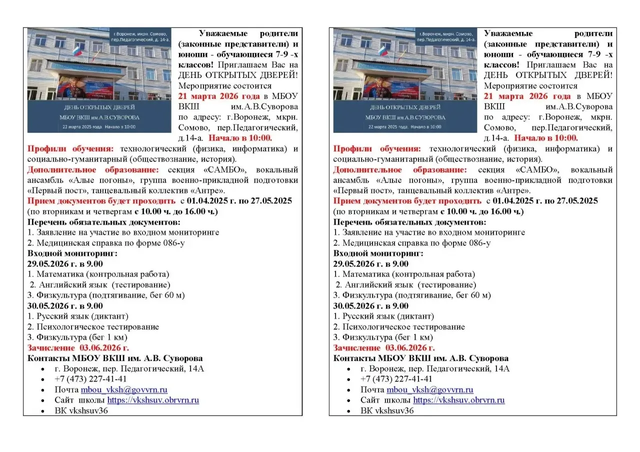 📌Информируем о том, что в рамках Всероссийской информационно-агитационной акции «Есть такая профессия - Родину защищать!», направленной информирование обучающихся образовательных организаций об особенностях поступления и обучения в кадетских школах страны, МБОУ ВКШ имени А.В. Суворова проводит 21.03.2026 в 10.00 профориентационное мероприятие «День открытых дверей».