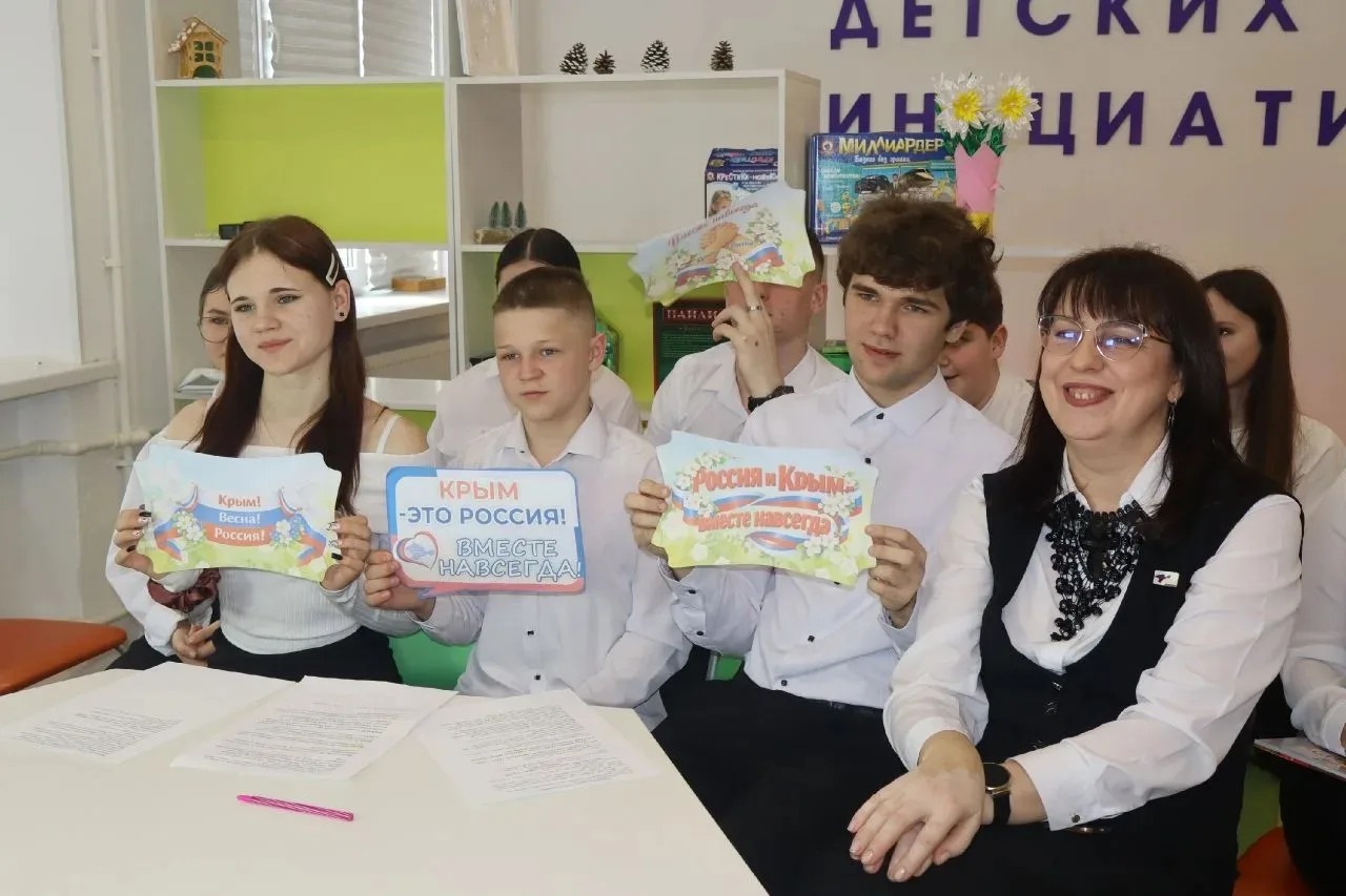 Телемост, посвящённый Дню воссоединения Крыма с Россией, позволил ребятам из двух школ рассказать о своей малой родине, о любви к её культуре и истории, о гордости за наше общее большое Отечество.