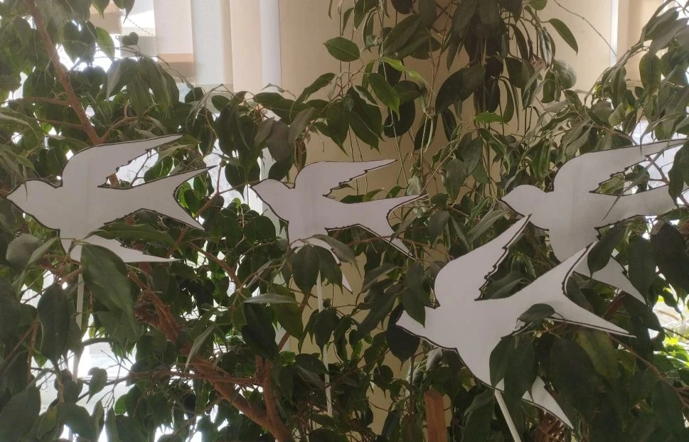 Было принято решение - создать на 3 этаже школы инсталляцию. На растениях разместили летящих ласточек. Пусть пока ими любуются все сотрудники и ученики школы.