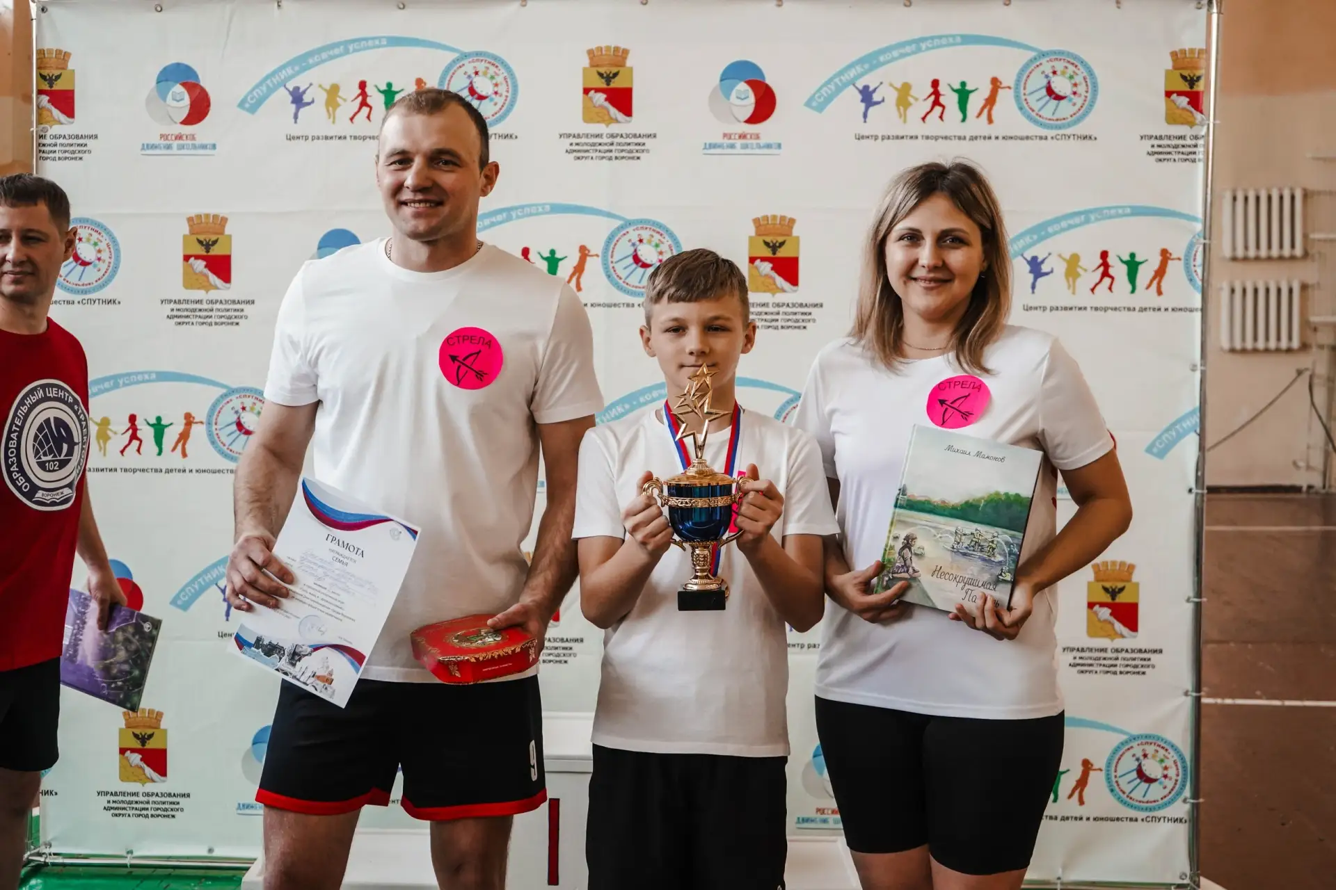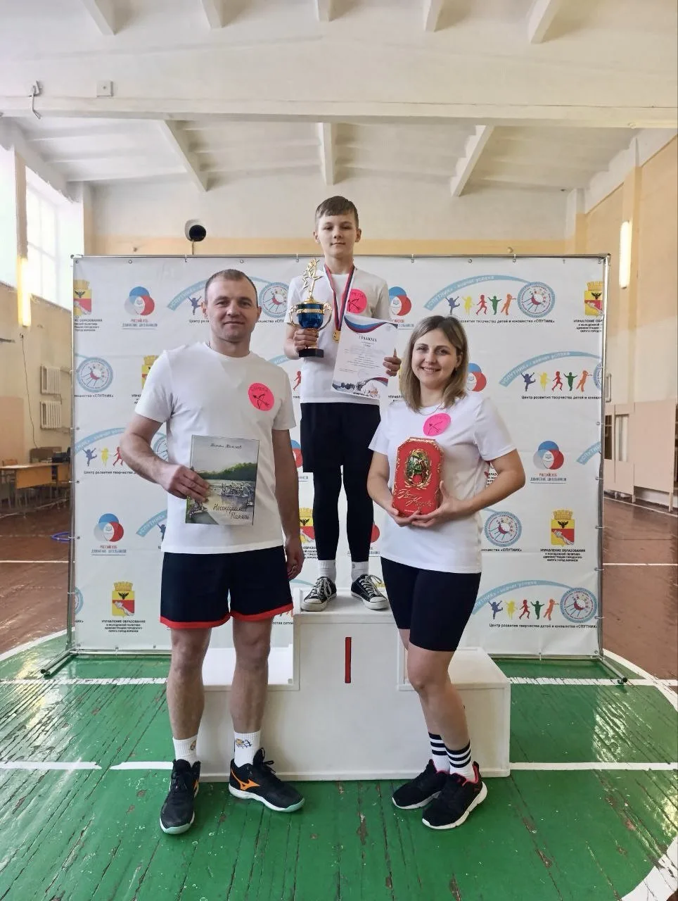 Ученик 5 "Г" класса Дронов Даниил вместе во своими родителями Александром Сергеевичем и Оксаной Юрьевной заняли 1 место в городской спортивной игре «Папа, мама, я – дружная семья!».
