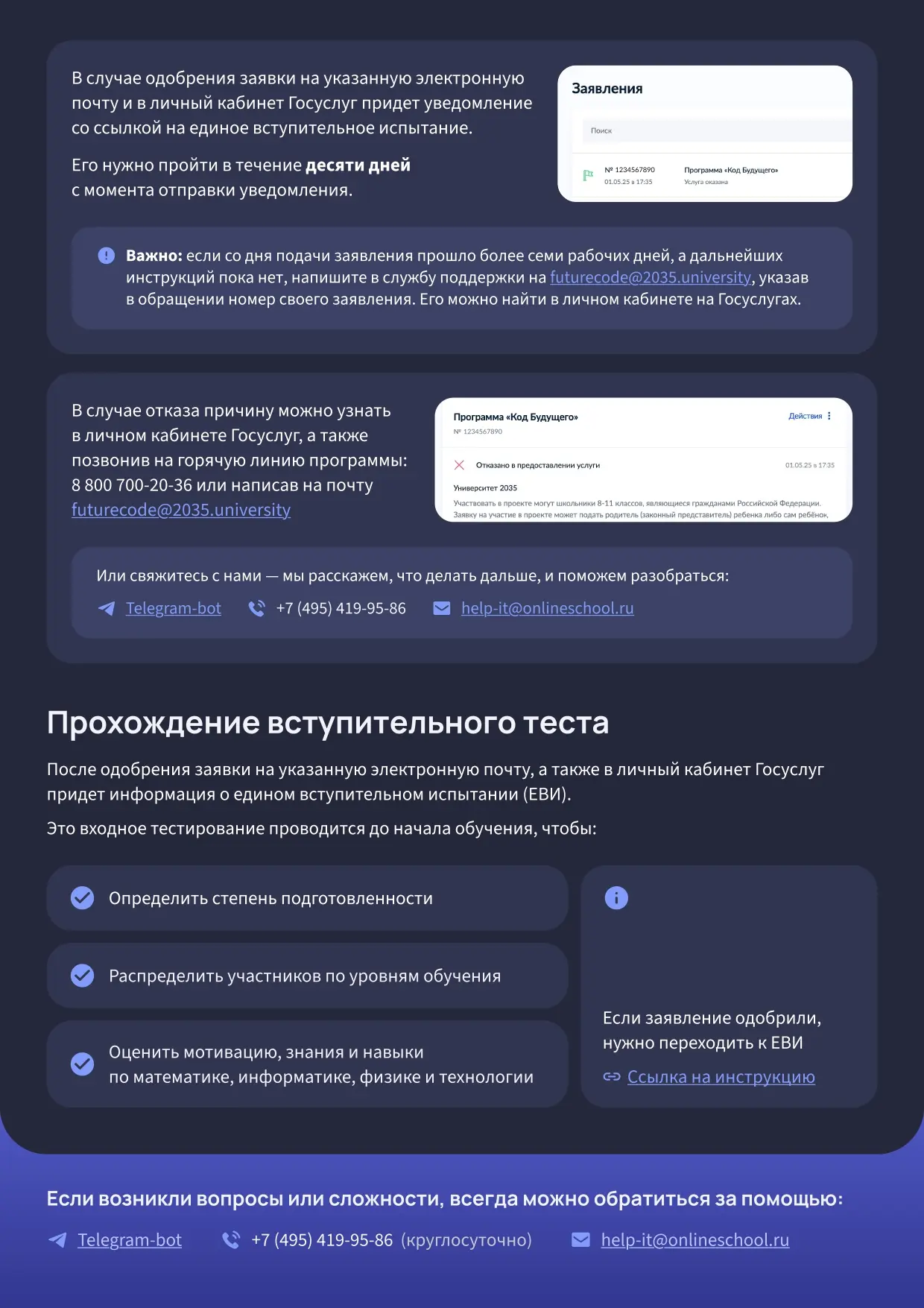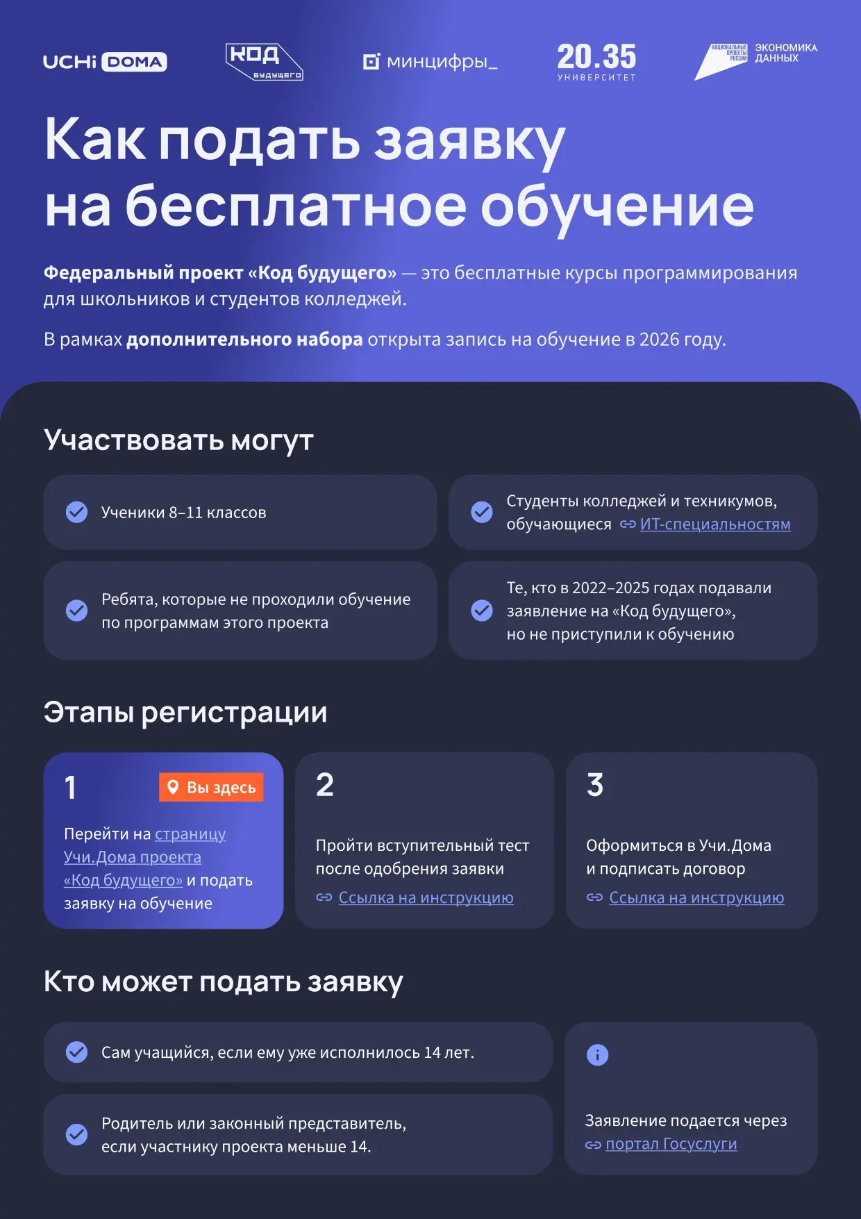 Присоединиться к «Коду будущего» можно, подав заявку через Госуслуги. Для этого нужно ознакомиться с условиями участия и инструкцией по регистрации, нажав кнопку Подать заявку на онлайн-курс на сайте: https://clck.ru/3NsAwE