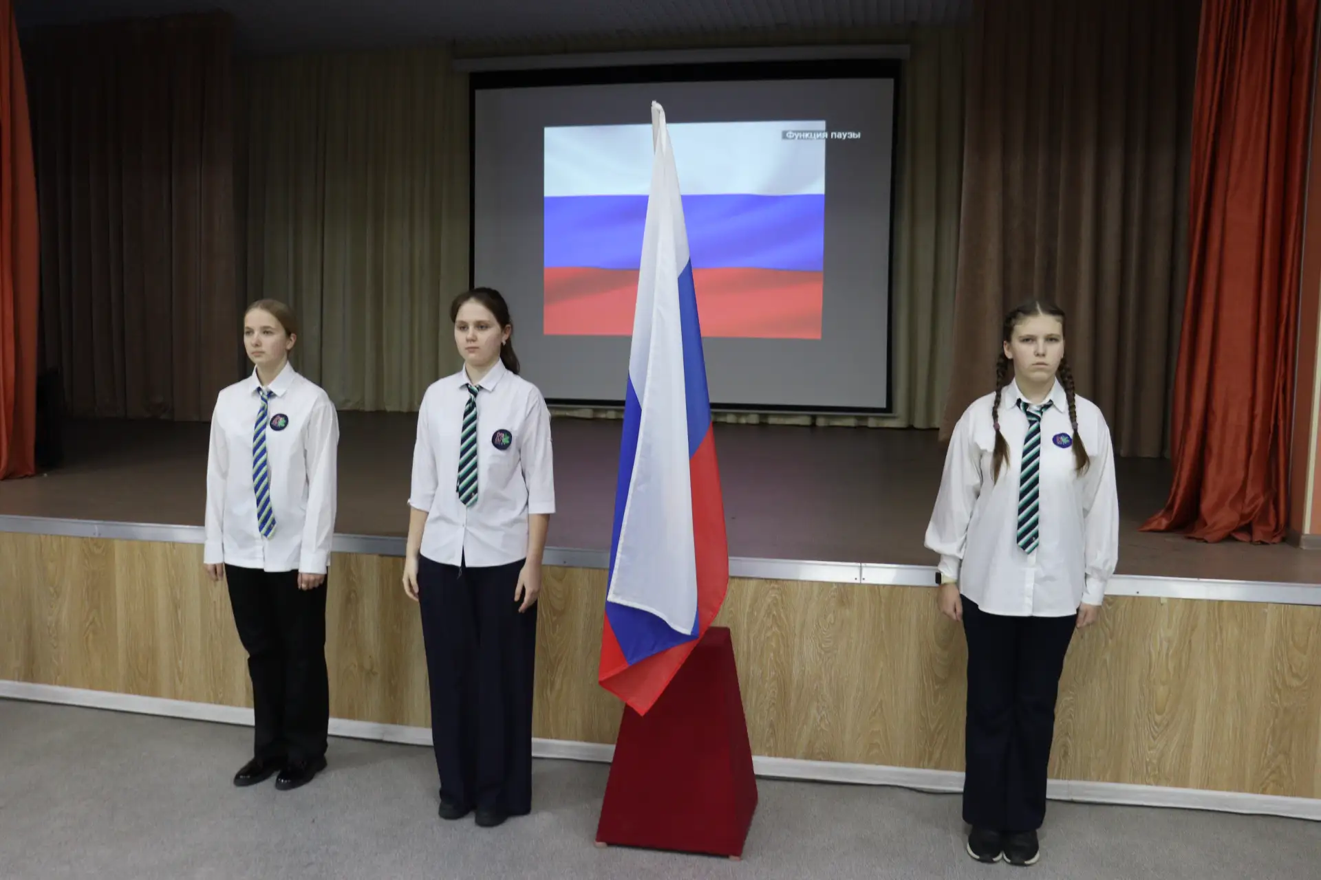 🥁 Состав знамённой группы - воспитанники школьного юнармейского отряда «О.С.А.»: Тарасова Виктория, Шитик Анна, Бакулина Карина.