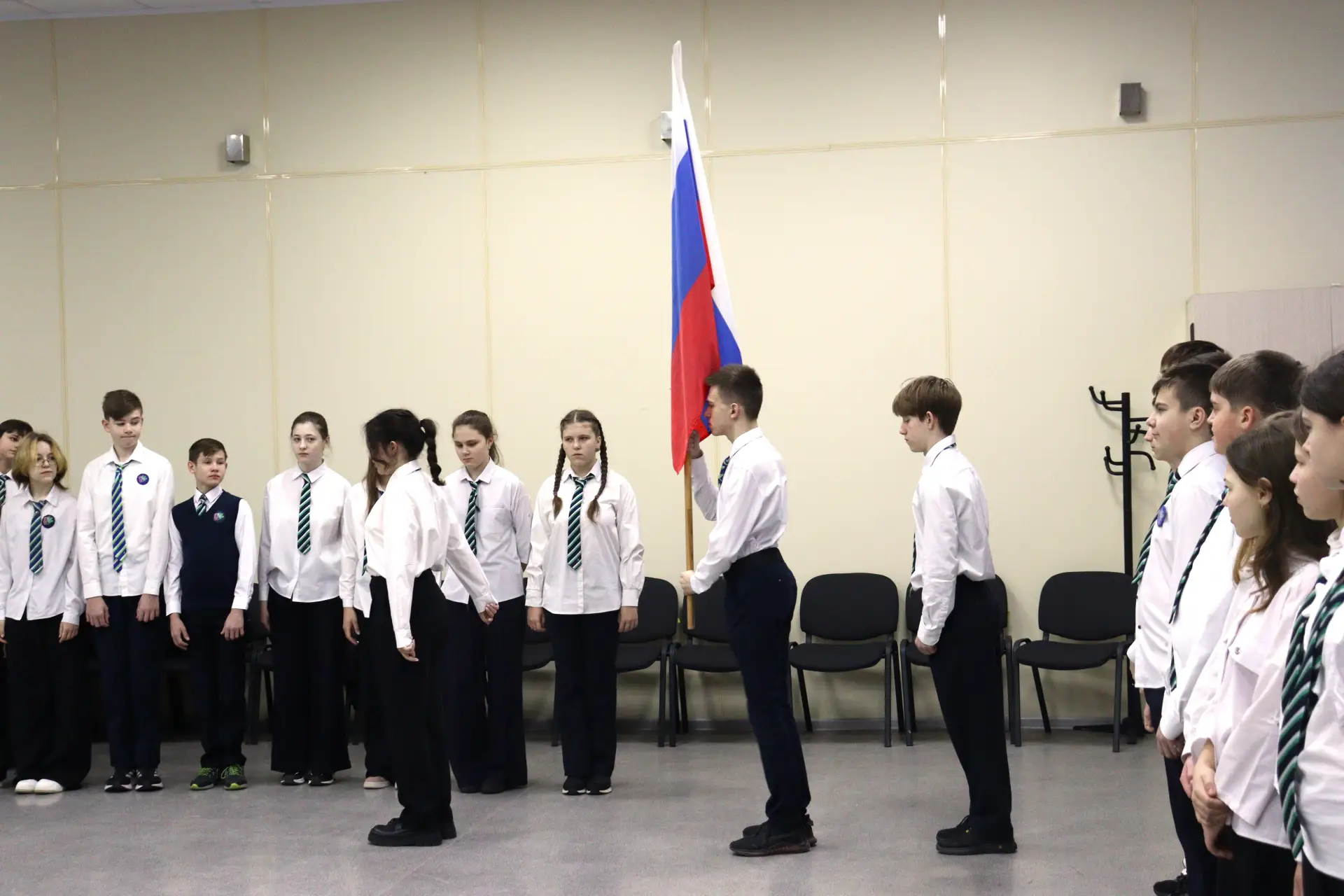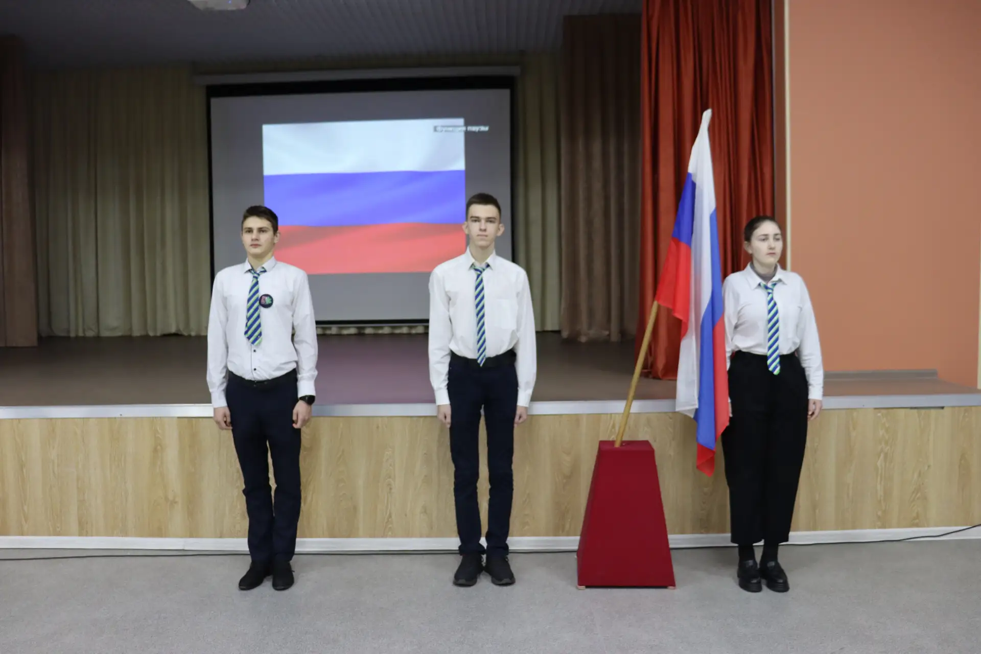 🥁 Состав знамённой группы - воспитанники школьного юнармейского отряда «О.С.А.»: Хрущев Даниил, Чесноков Степан, Духанина Виктория.
