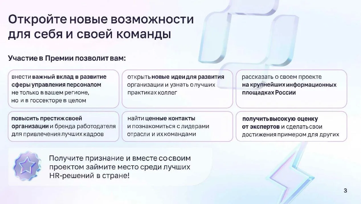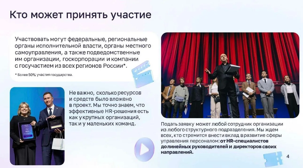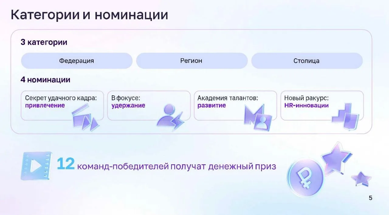 Конкурс объединяет лучшие практики сферы управления персоналом со всей России. Участие позволит заявить о достижениях вашего региона в области работы с кадрами на уникальной площадке для госсектора, а также получить оценку ведущих экспертов и признание HR-сообщества.