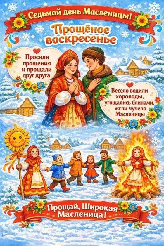 Прощённое воскресенье. В последний день Масленицы люди просили друг у друга прощения за все обиды, чтобы вступить в пост с чистым сердцем. Приглашаем вас и ваших близких на традиционное масленичное гулянье в воскресенье 22 февраля на главную площадь нашего города!❤️