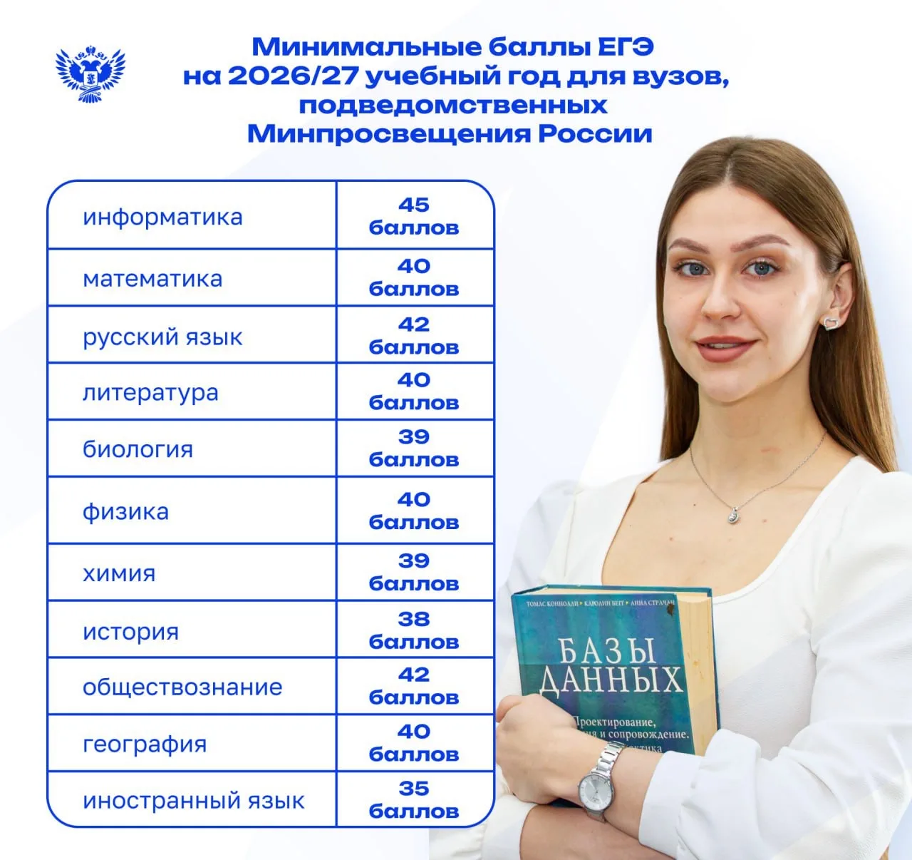 ✅ Минпросвещения России утвердило минимальные баллы ЕГЭ для подведомственных вузов на 2026/27 учебный год