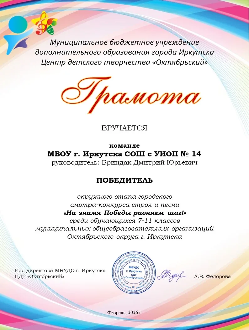 Поздравляем команду юнармейцев нашей школы с победой в окружном этапе городского конкурса строя и песни «На знамя Победы равняем шаг!».