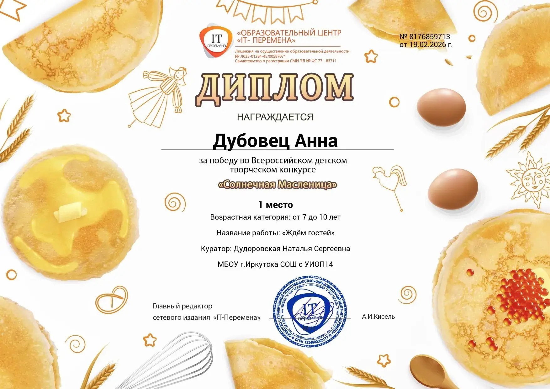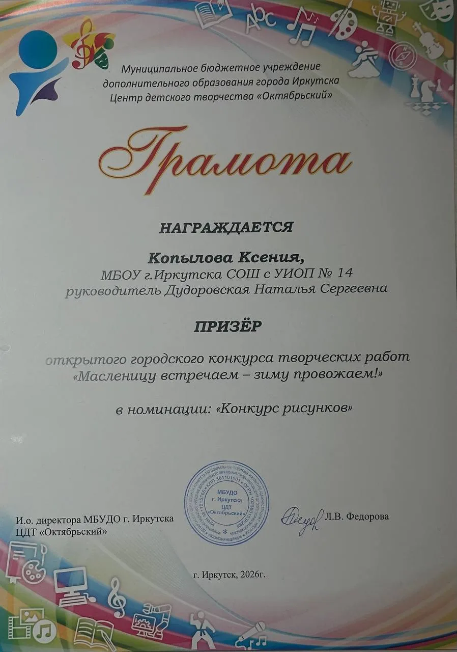 Открытый городской конкурс творческих работ «Масленицу встречаем – зиму провожаем!», Копылова Ксения-призёр