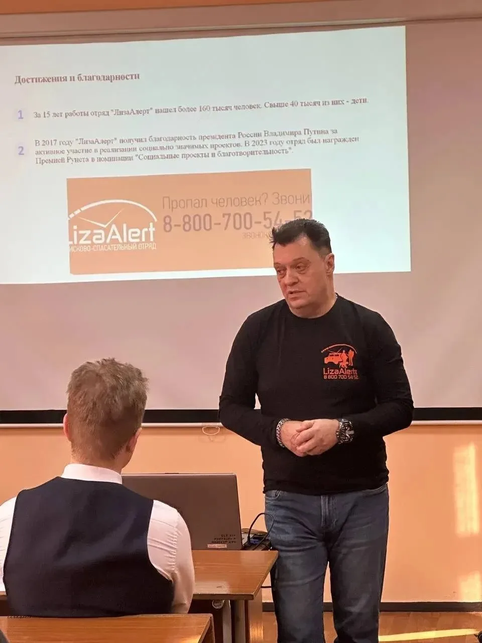Спикером выступил учитель истории и обществознания нашей школы, член ГЭК Артур Владимирович Балицкий — старший поисковой группы поисково-спасательного отряда ЛизаАлерт.