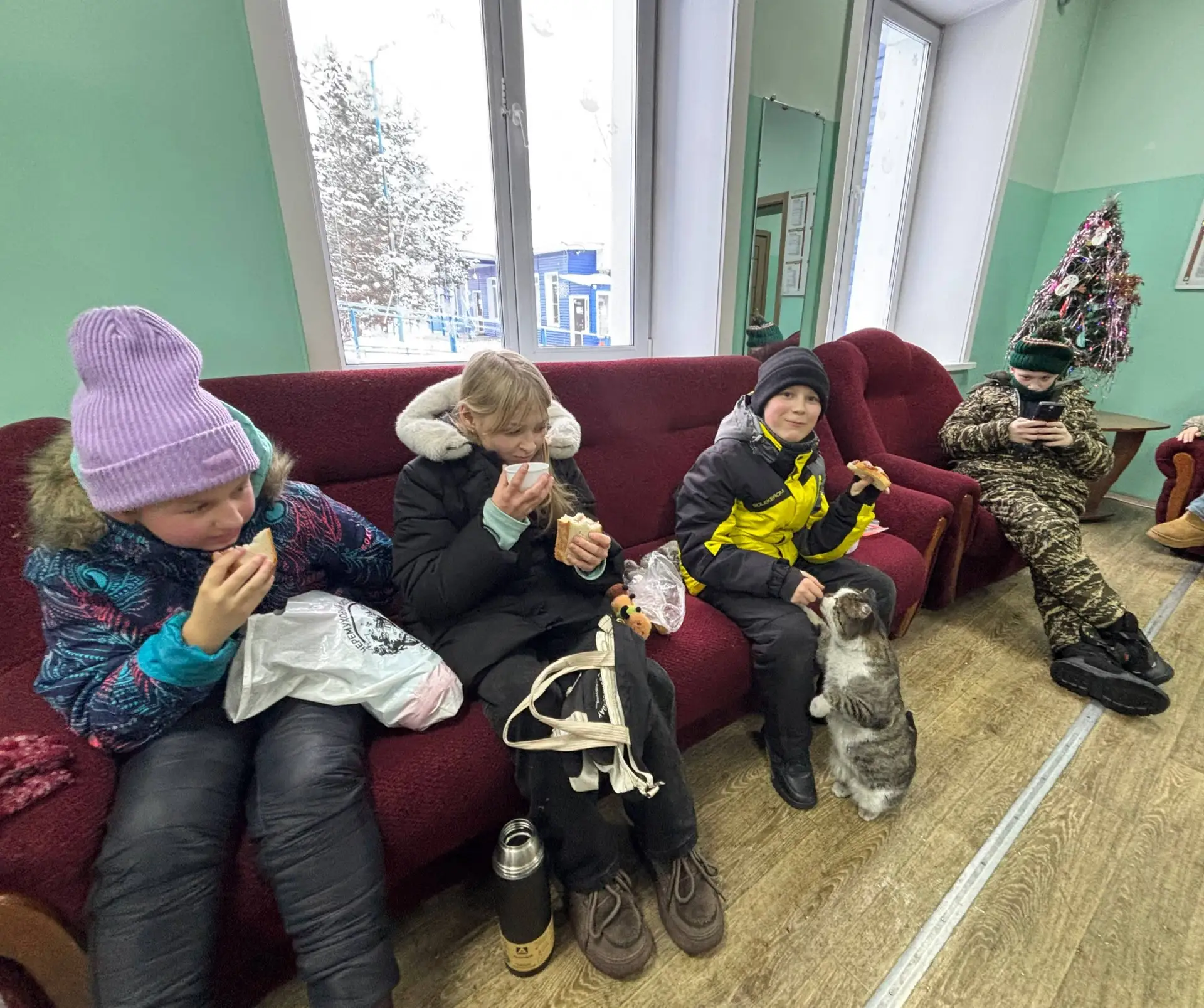 🎄8 января: Лыжный поход на базу! ⛷️☀️ Погода была подарком — солнечно и тепло. После прогулки всех ждал горячий чай с бутербродами и главный гость — пушистый кот Барсик 🐱, создавший домашний уют.