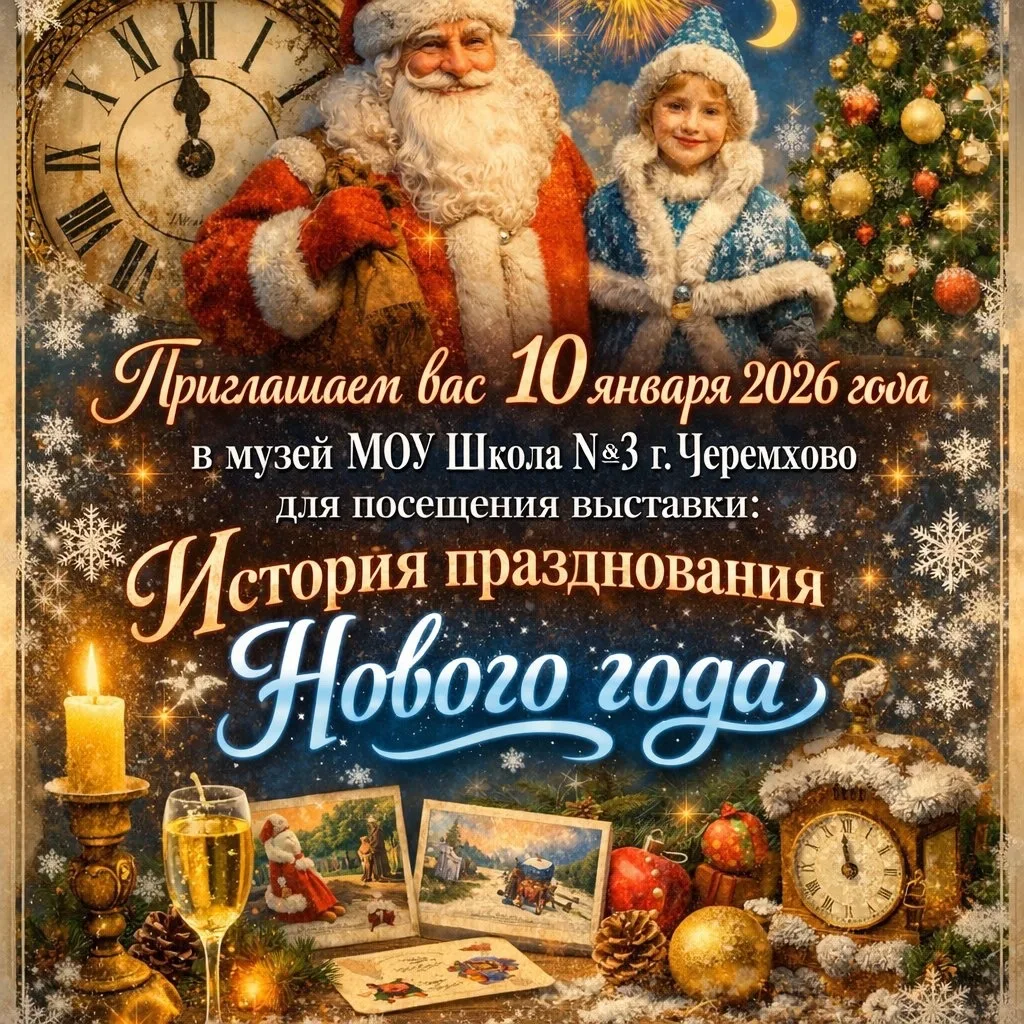 Приглашаем вас завтра, 10 января 2026 года, в 12:00 в музей школы №3 на выставку «История празднования Нового года». Организатор выставки — Стукалева Елена Викторовна. Мероприятие проходит в рамках реализации плана «Зимние забавы».