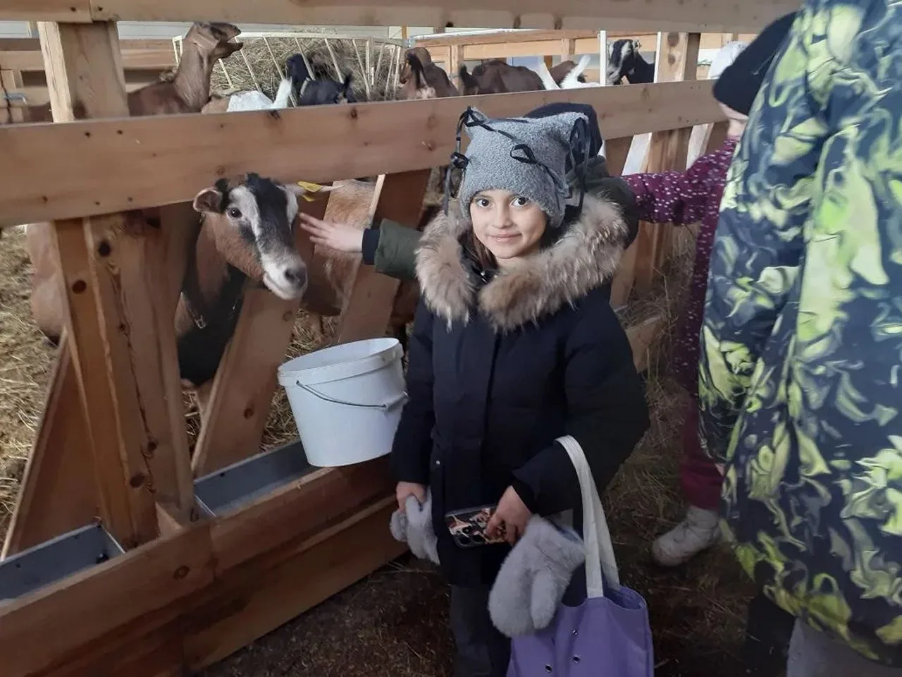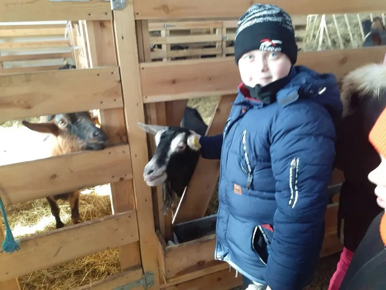 Сначала ребята познакомились с животными, которые находятся на ферме - это козы. Дети смогли их покормить, приласкать. Это довольно дружелюбные животные.