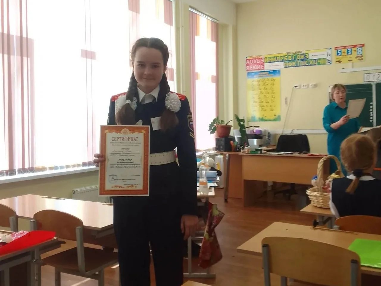 Отделение кадетского класса в общем зачёте - 4 место. Командир Смородникова Евгения награждена грамотой "Лучший юнармеец". Отделение отмечено в номинации "Лучшая знаменная группа".