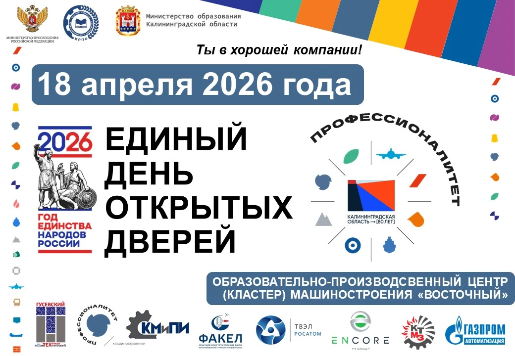 ✅ Дорогие школьники, родители и представители школ! 1️⃣8️⃣ апреля 2026 года в Гусевском Политехе и кластере машиностроения "Восточный" пройдёт Единый день открытых дверей ПРОФЕССИОНАЛИТЕТ | Федеральный проект национального проекта «Молодёжь и дети»