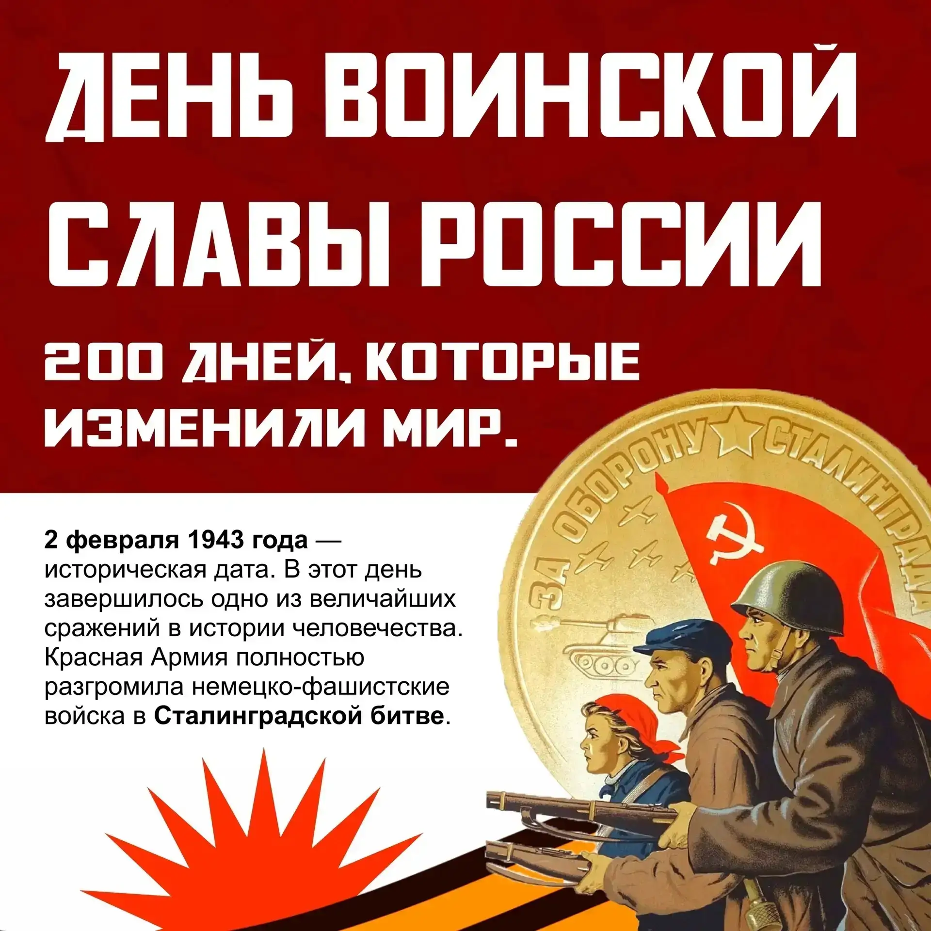 2 февраля — День воинской славы России, день разгрома советскими войсками немецко-фашистских войск в Сталинградской битве.