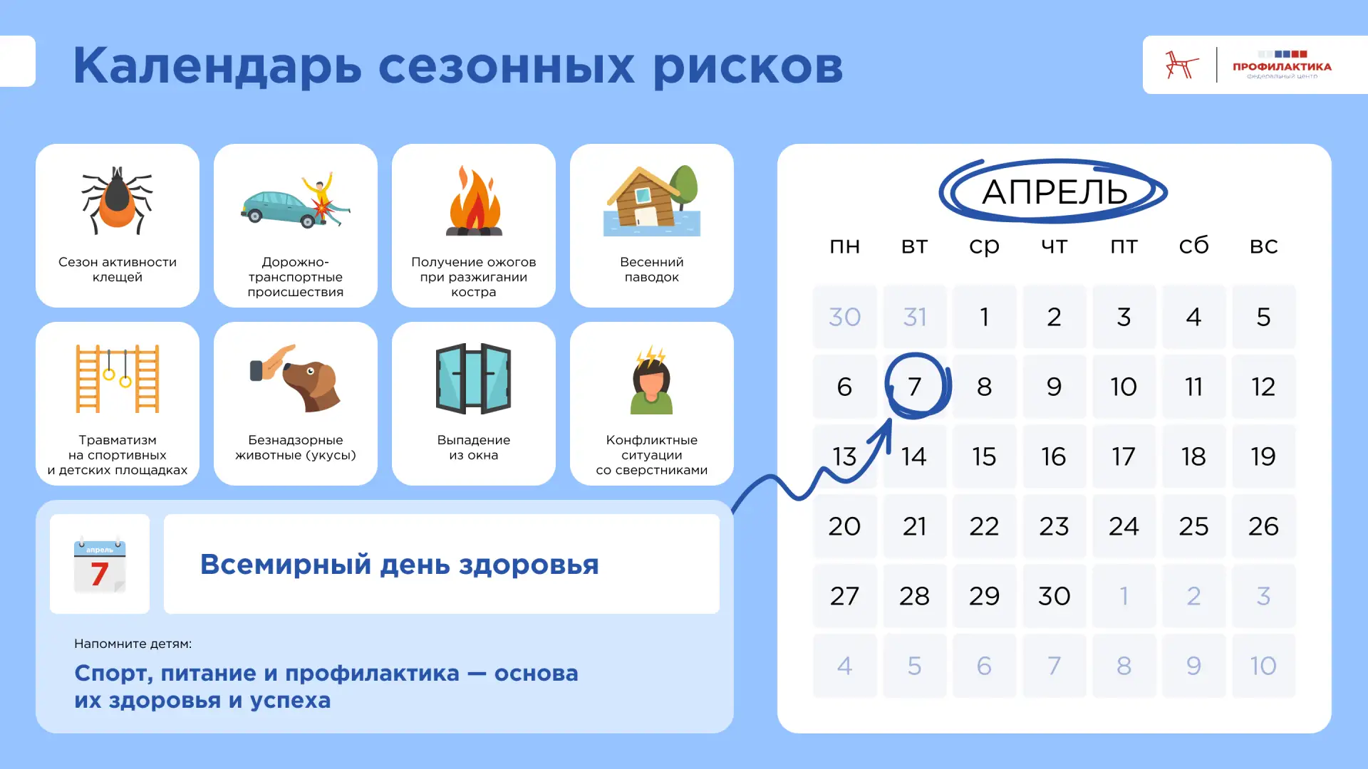 Мы подготовили актуальный календарь сезонных рисков на апрель на основе материалов коллег и партнеров из Тульской области. Важно не только знать о них, но и объяснить детям правила безопасности.
