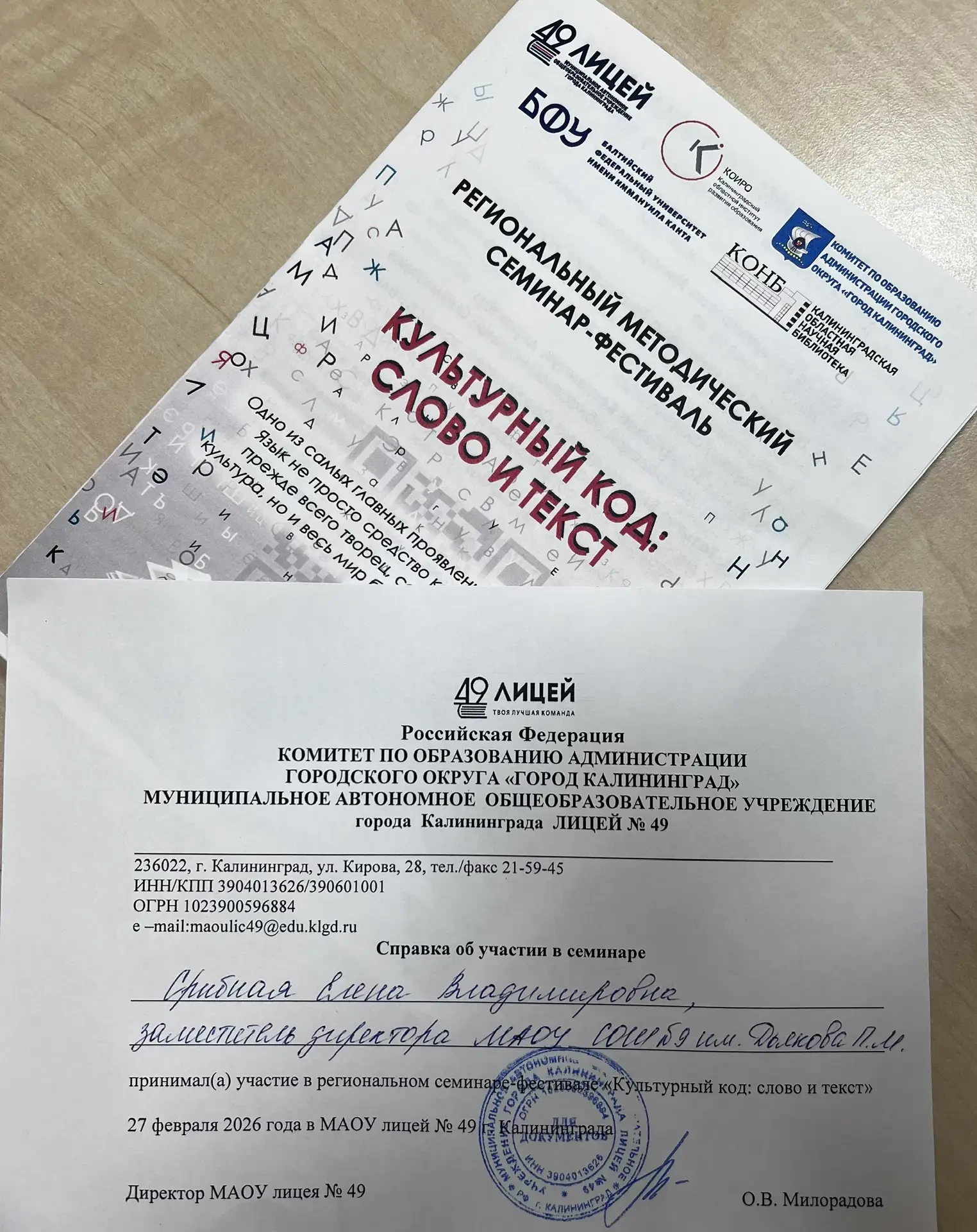 27 февраля в МАОУ Лицей №49 г.Калининград прошел региональный методический семинар-фестиваль «Культурный код: слово и текст», посвященный памяти Людмилы Николаевны Соколовой.