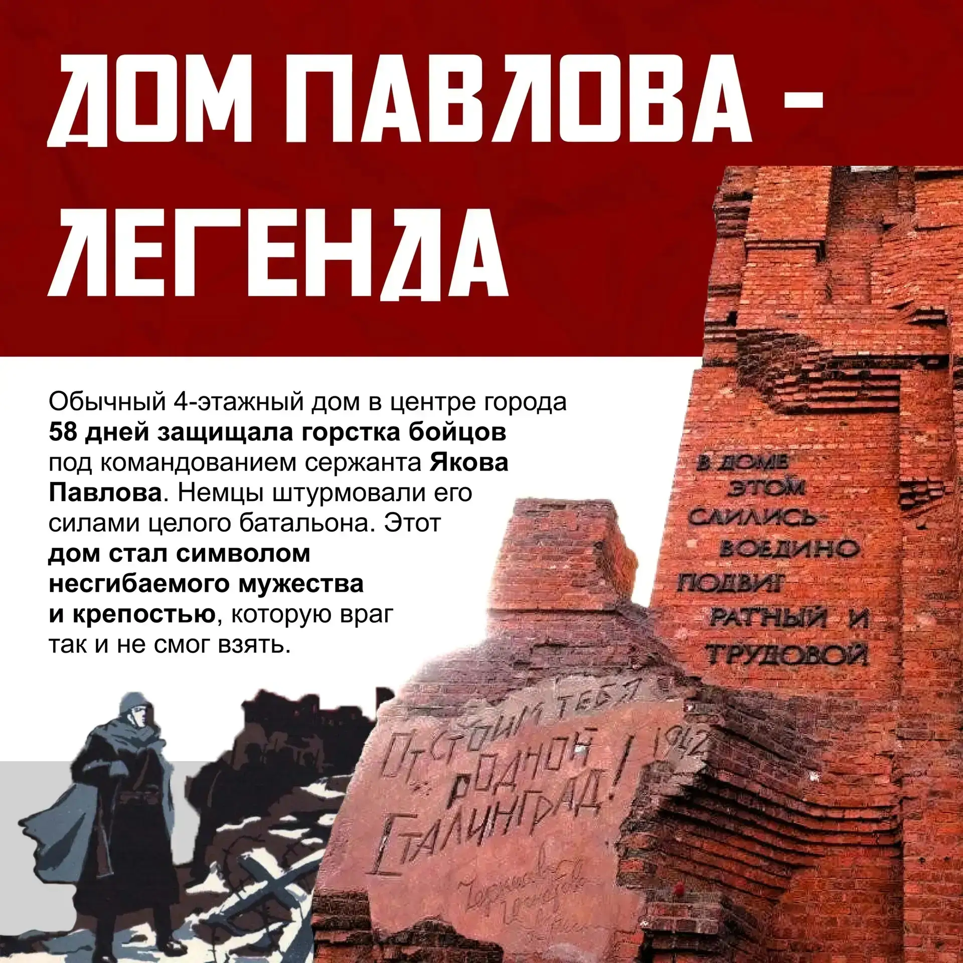 В ходе обороны советские солдаты сражались за каждый дом, за каждый метр земли. Враг бросил на Сталинград огромные силы, но встретил непреодолимое сопротивление. 2 февраля 1943 года капитулировала окружённая группировка противника во главе с фельдмаршалом Паулюсом.
