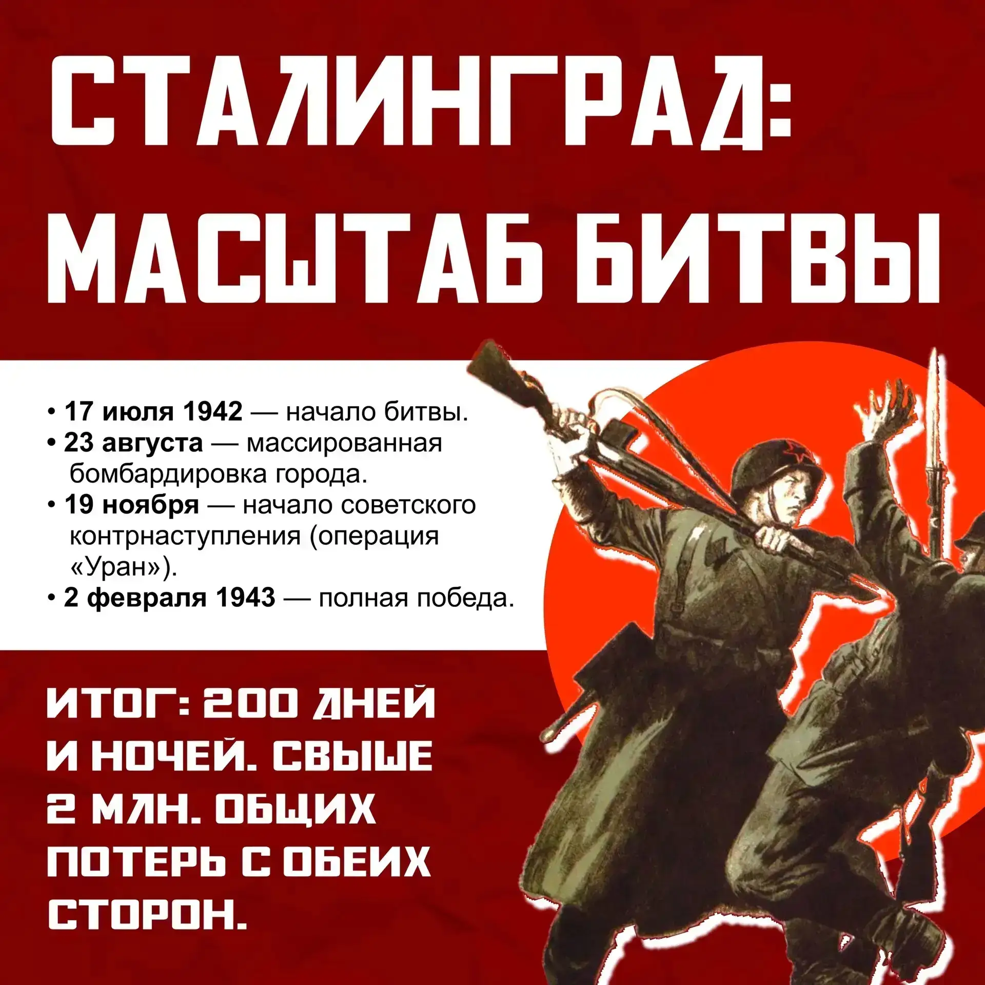 Сталинградская битва, длившаяся 200 дней и ночей (17 июля 1942 — 2 февраля 1943), стала переломным моментом Великой Отечественной войны. Защищая город, советские войска не только отразили наступление врага, но и перешли в контрнаступление, окружив и разгромив немецко-фашистские силы.
