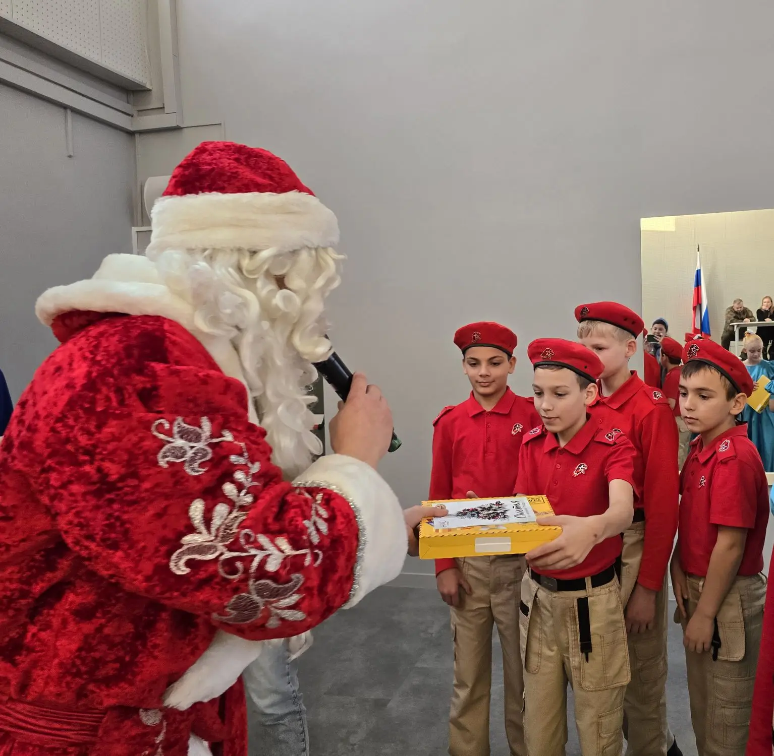 Всех участников бала поздравил Дедушка Мороз. С тёплой улыбкой он вручил каждому сладкий подарок.🎁