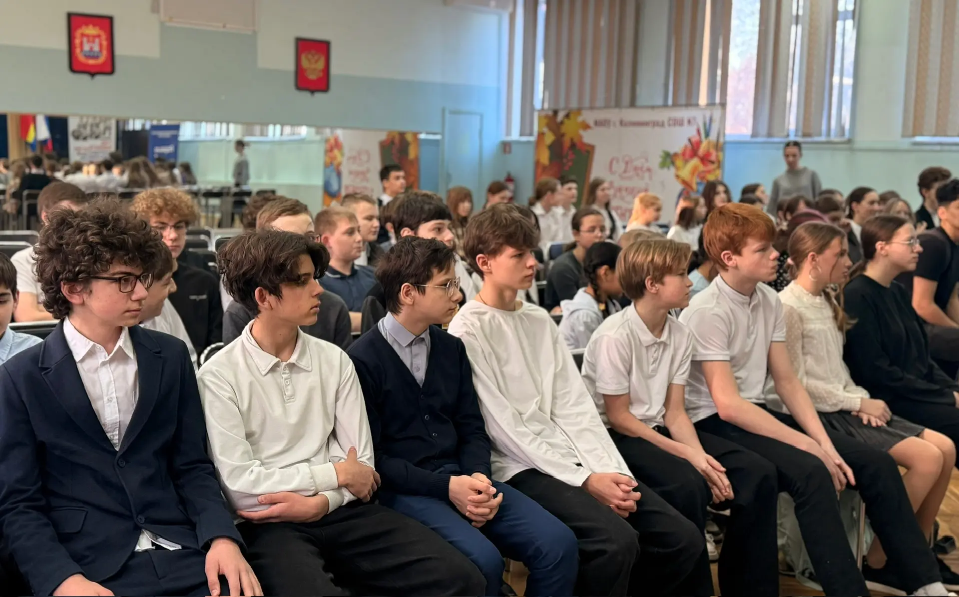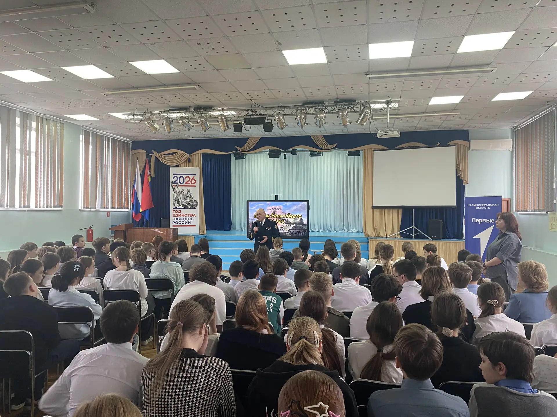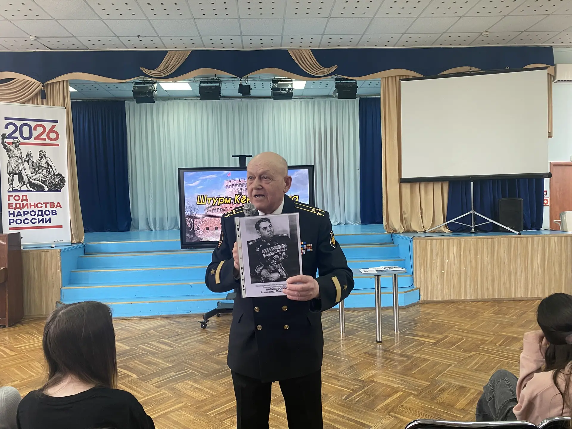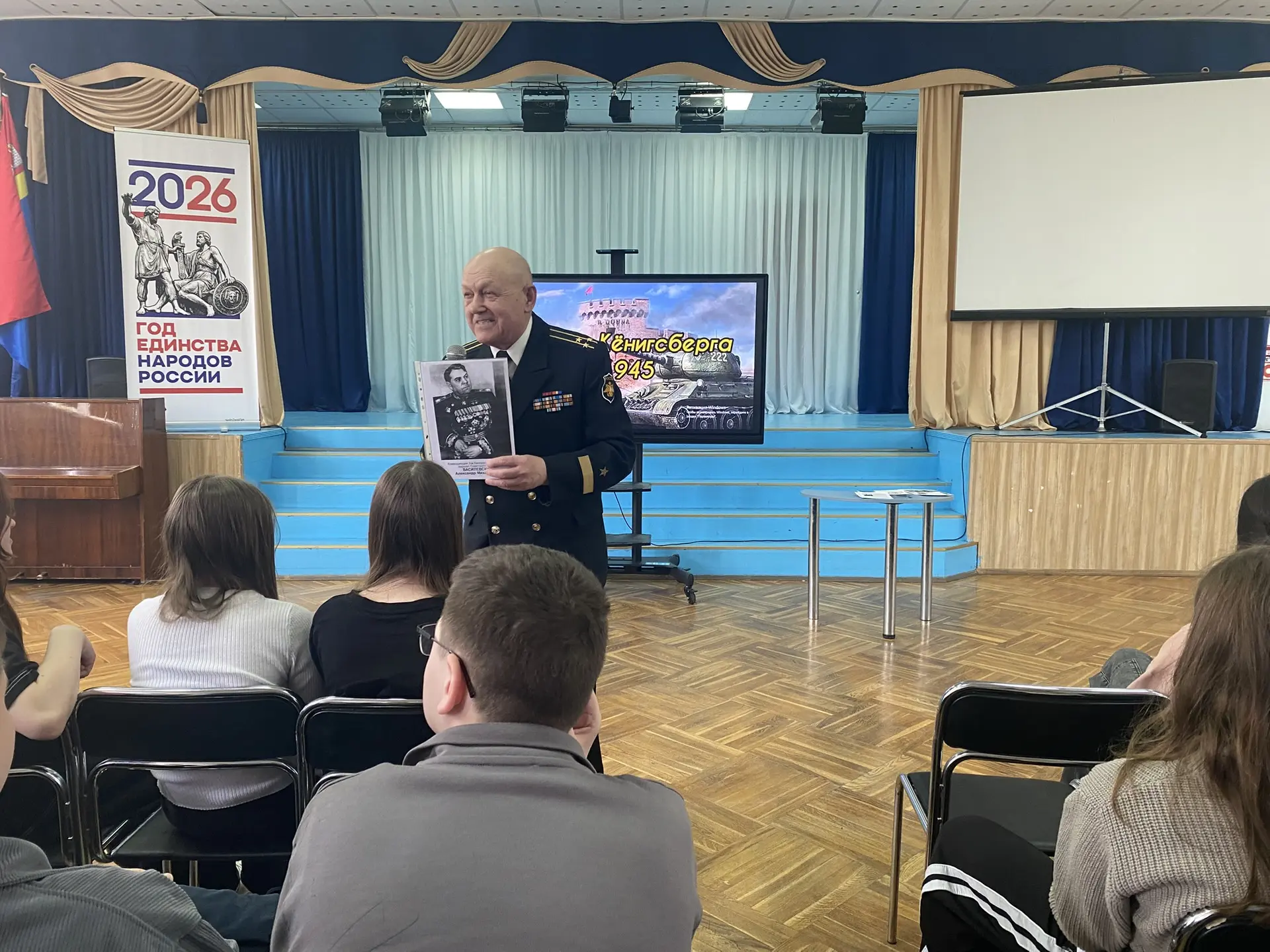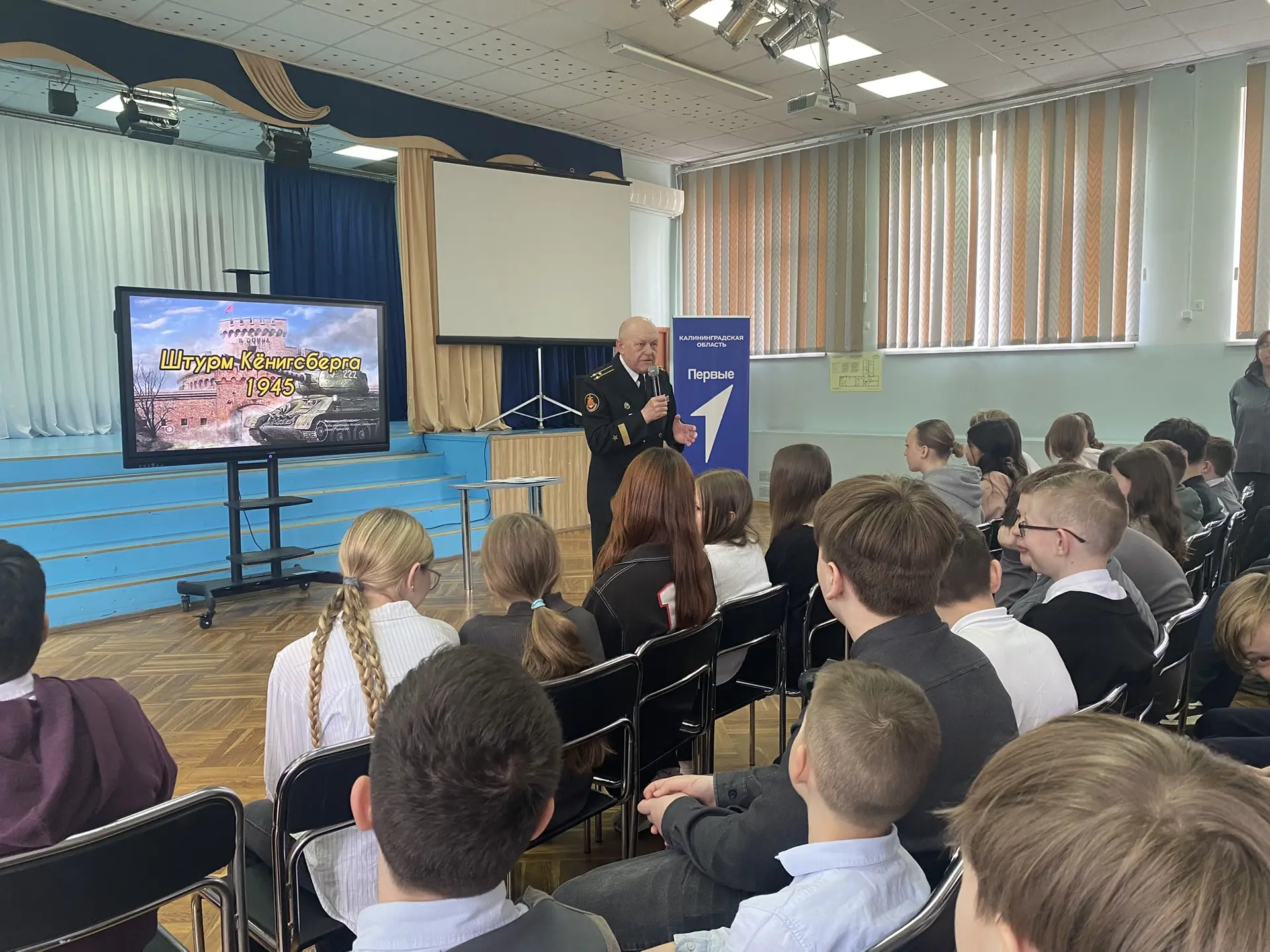 Сегодня в актовом зале школы состоялся "Урок мужества" с Гуровым Сергеем Александровичем — ветераном Балтийского флота, капитаном 1‑го ранга в отставке, членом Союза писателей и журналистов России, а также выпускником школы № 7. Учащиеся параллели 6 классов — 6А, 6Б, 6В, 6Г и 6С — погрузились в события одной из ключевых операций Великой Отечественной войны: штурма Кёнигсберга.