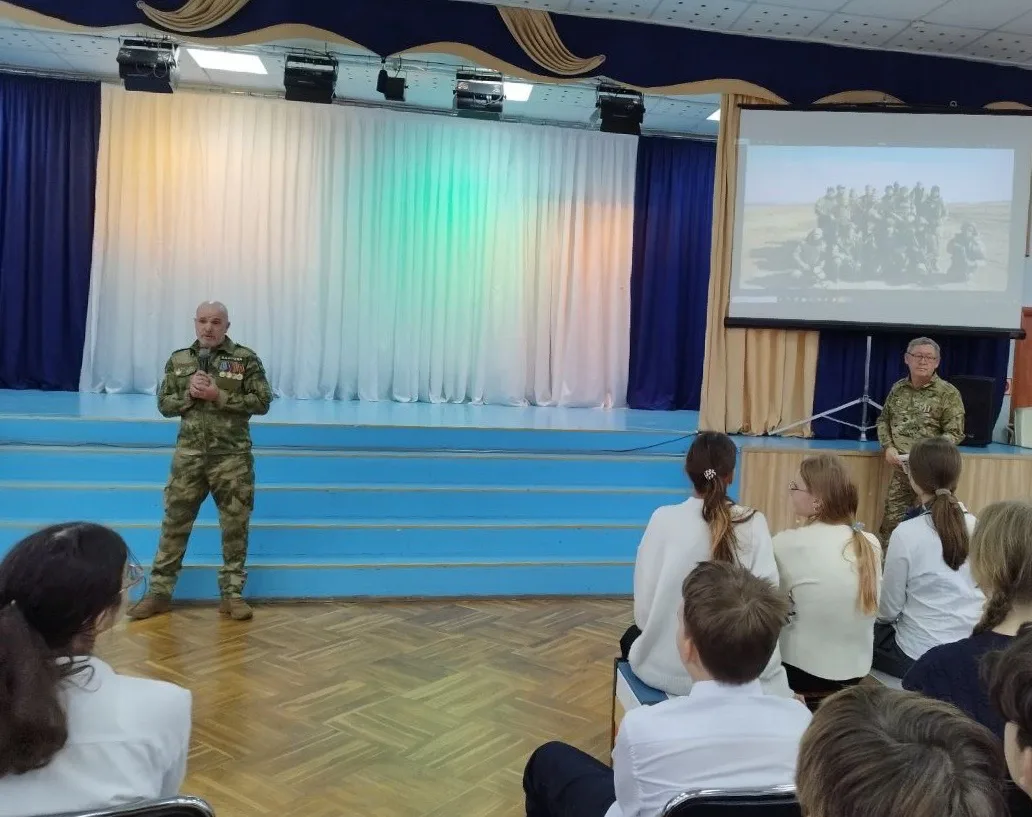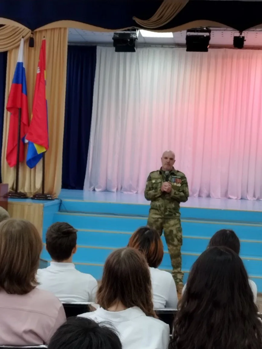 Перед учащимися 7–8 классов гость выступил с проникновенным патриотическим рассказом. Он поделился воспоминаниями о героических буднях военных и добровольцев, о мужестве и взаимовыручке, о том, что движет людьми, которые встают на защиту своей страны.