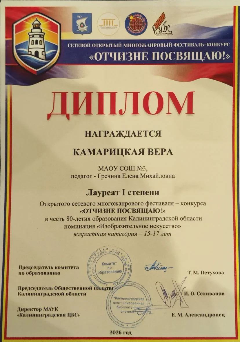 🏆 А в конкурсе «Изобразительное искусство» лучшей была признана работа учащейся 8г1 класса Камарицкой Веры, удостоившейся высшей награды — диплома лауреата I степени.