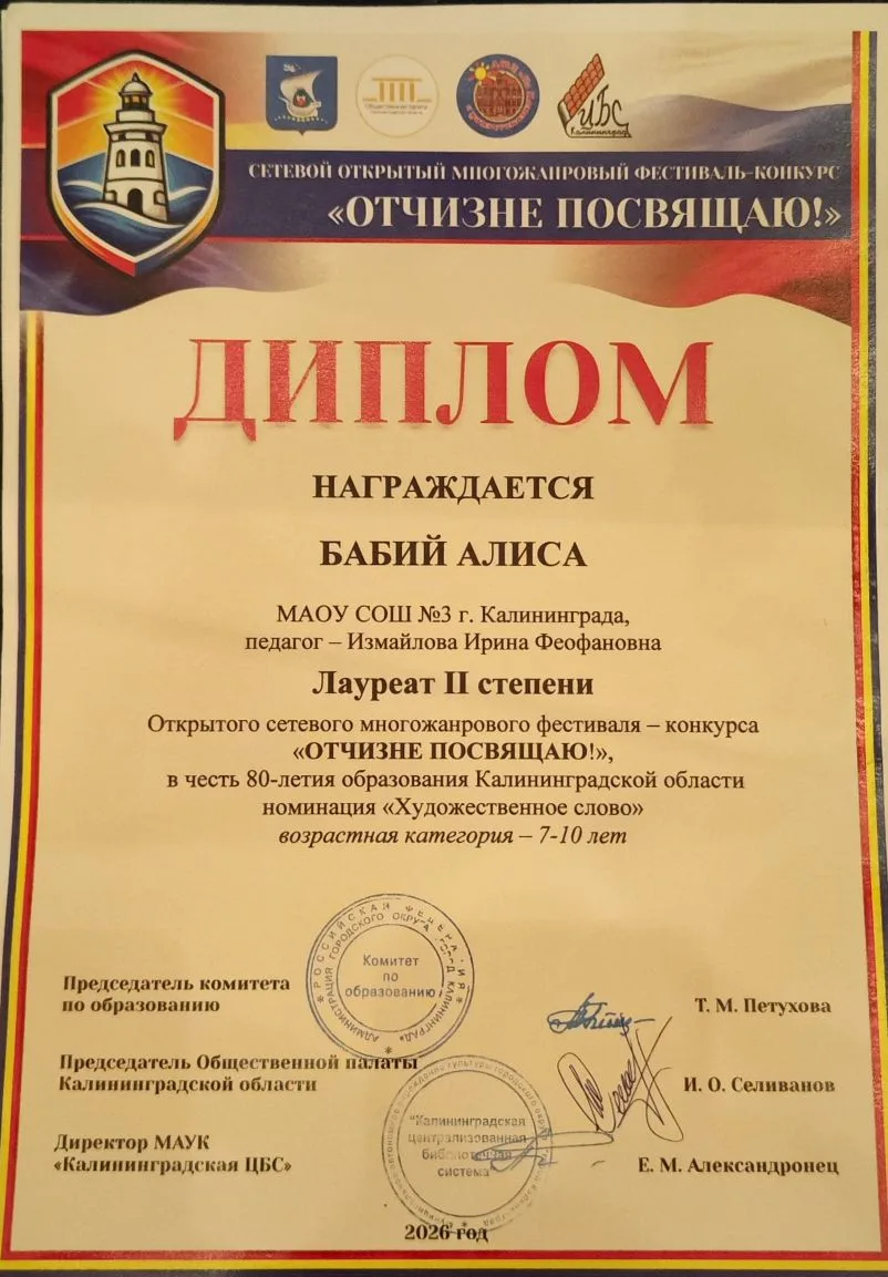 ✅Всего в Олимпиаде приняло участие более 200 обучающихся школ города Калининграда и области.🏆 В список победителей, набравших максимальное количество баллов и прошедших во второй этап, вошла ученица 4г1 класса Имамова Амина.