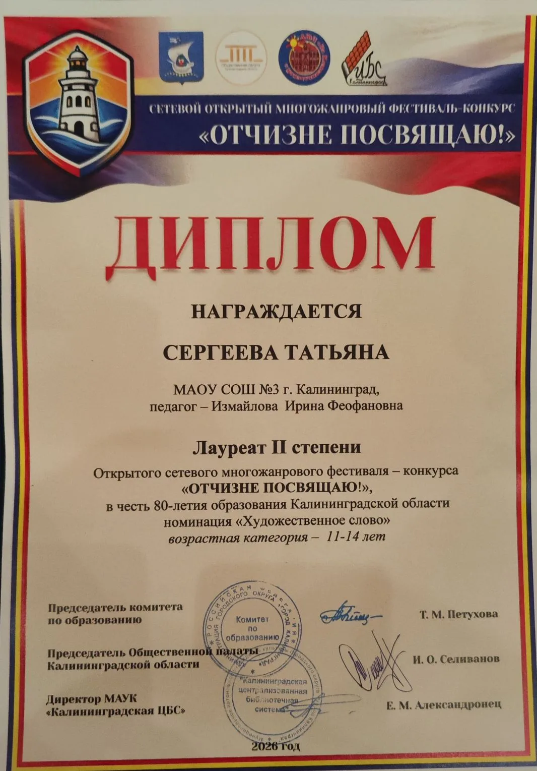 🎤✨ 2 марта во Дворце культуры железнодорожников прошёл великолепный гала-концерт открытого сетевого многожанрового фестиваля-конкурса «Отчизне посвящаю!», приуроченного к славному юбилею — 80-летию образования Калининградской области. Это событие стало настоящим праздником искусства и творчества!