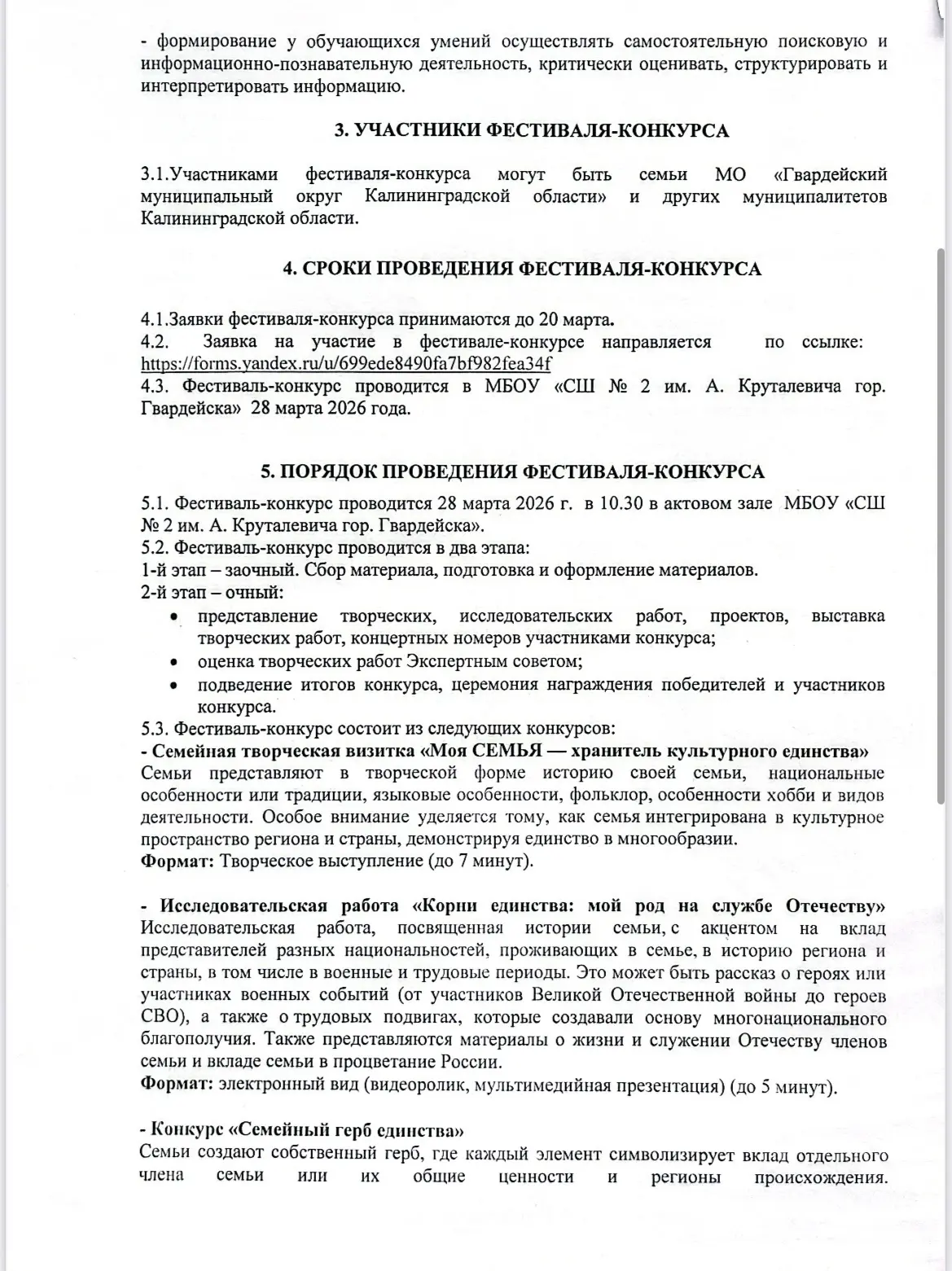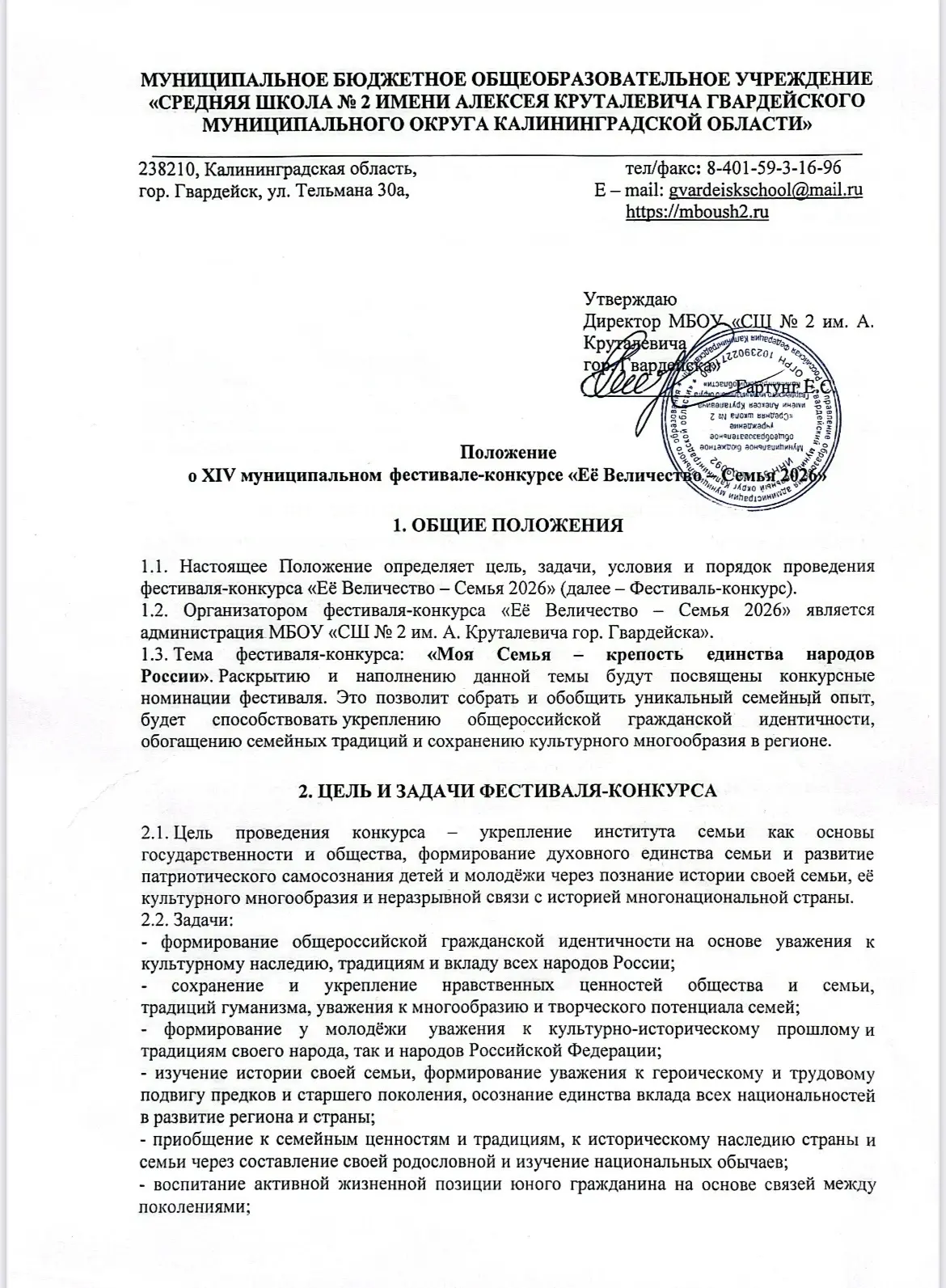 ✨ 28 марта в стенах МБОУ "СШ № 2 им. А. Круталевича гор. Гвардейска" состоится долгожданное событие — ХIV муниципальный фестиваль-конкурс «Её Величество — Семья 2026».