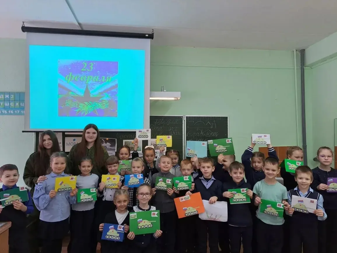 Во 2 «Э» классе прошел замечательный мастер-класс по созданию праздничной открытки. Роль учителей на себя примерили юнармейцы из 8 «В» класса.