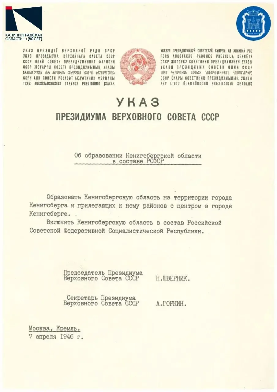 7 апреля 1946 года в составе РСФСР образовали Кёнигсбергскую область. В июле того же года её переименуют в Калининградскую.
