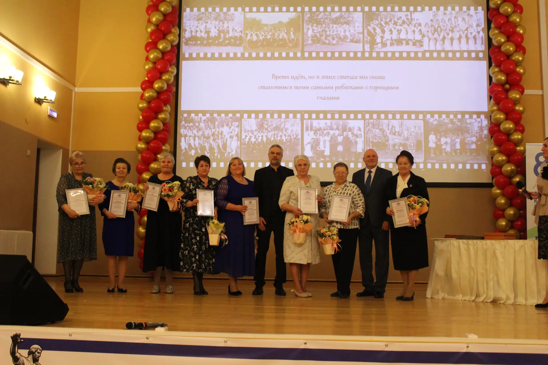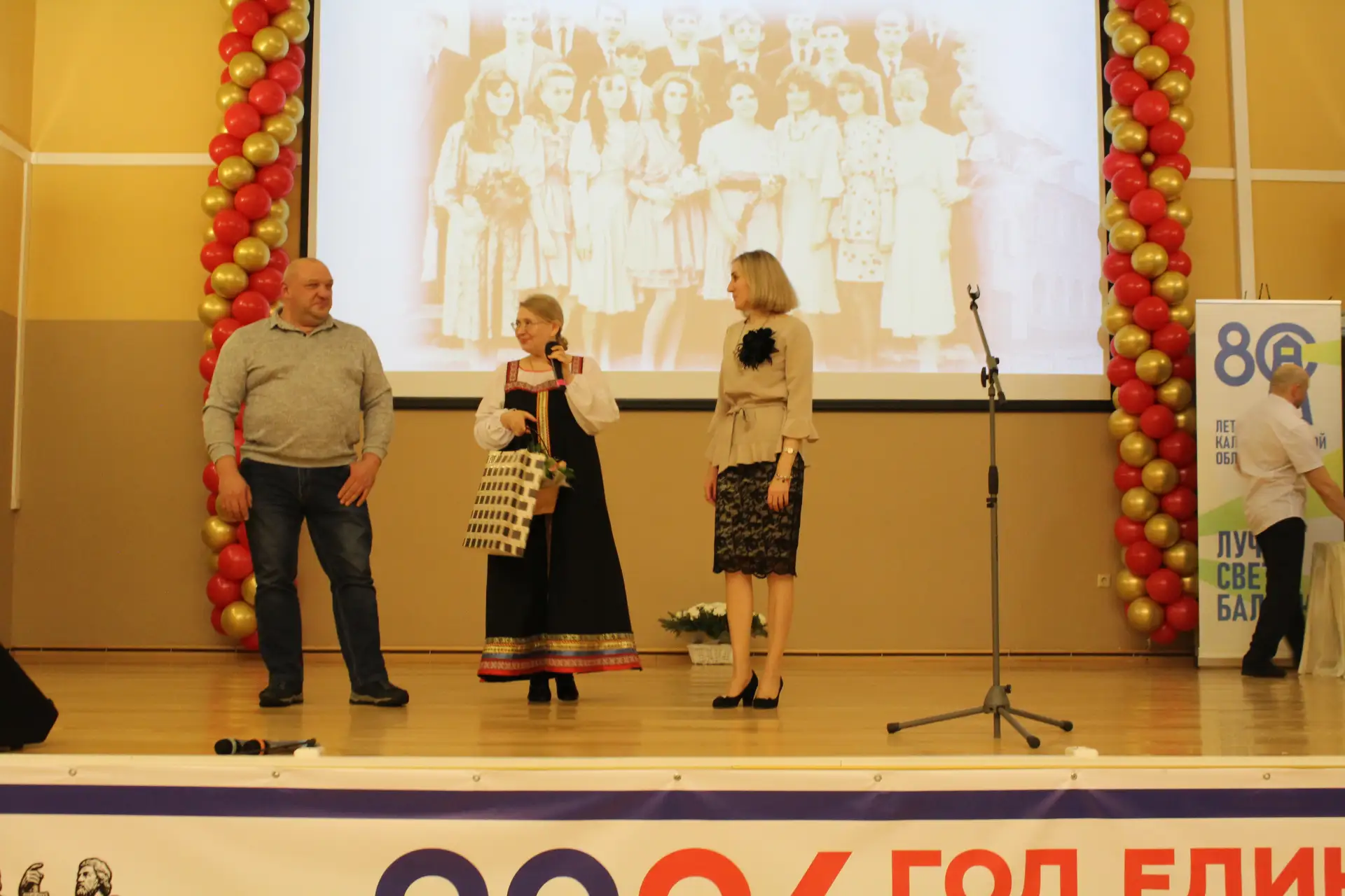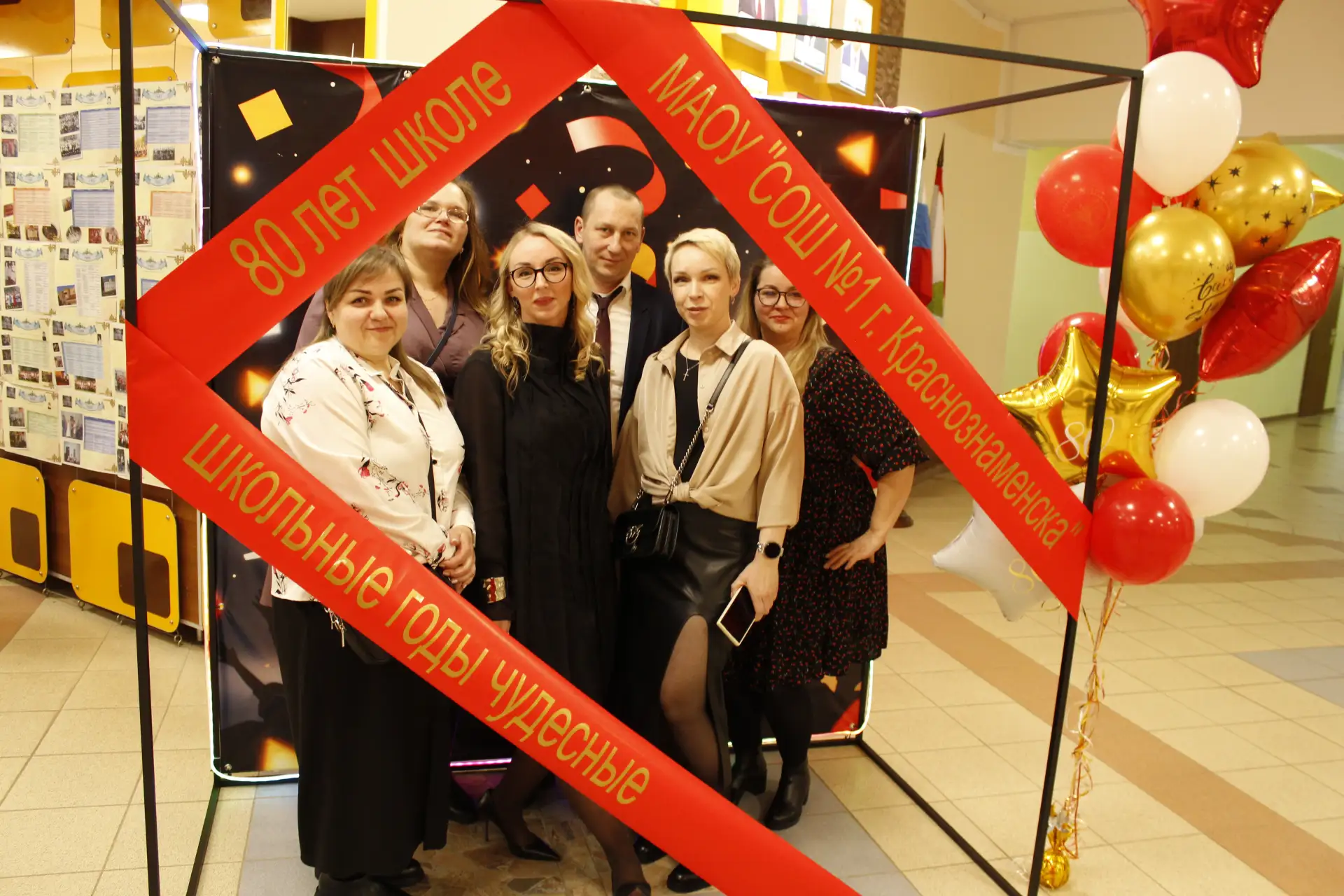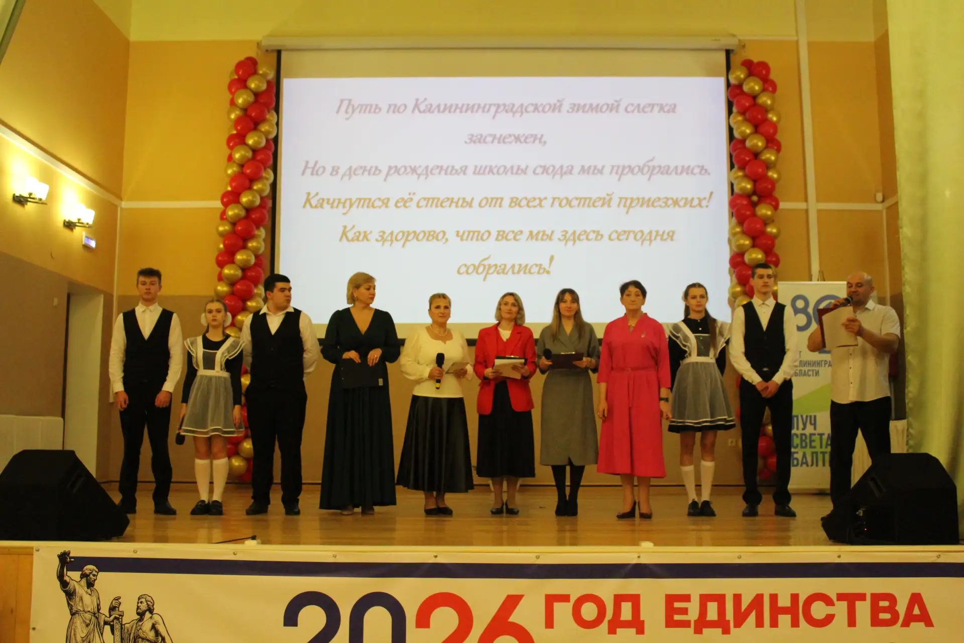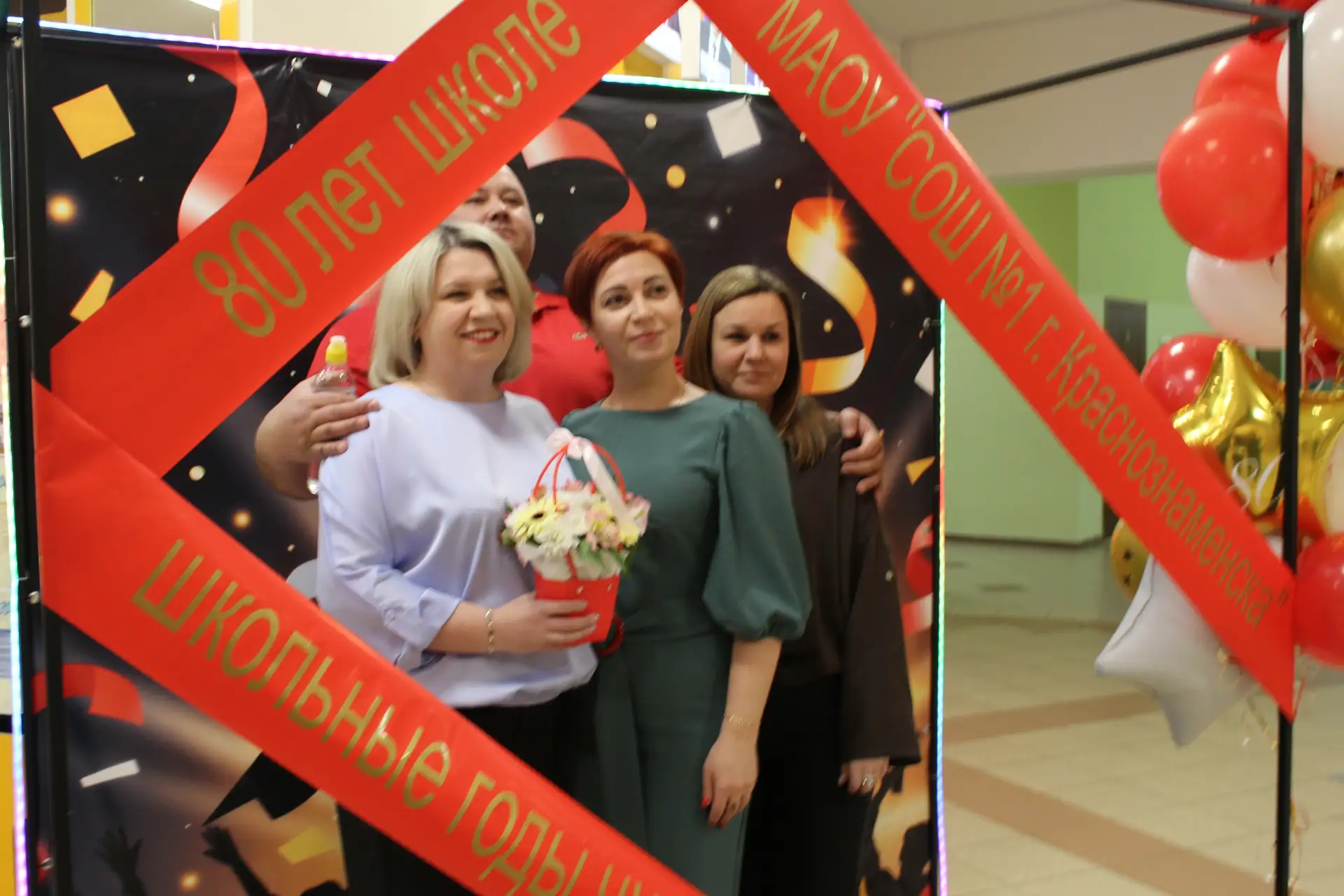 Актовый зал был наполнен улыбками и радостными возгласами узнавания. С приветственным словом к гостям и педагогам-ветеранам обратился глава Краснознаменского муниципального округа Макаров Виктор Георгиевич и Дмитрий Гариевич Чмыхов, депутат Законодательного Собрания Калининградской области. Также поздравить школу с юбилеем пришла председатель Общественного Совета Краснознаменского муниципального округа Ключникова Татьяна Семёновна. Она окончила нашу школу, работала в ней учителем математики и долгие годы руководила Отделом образования Краснознаменского района. И, находясь на этом посту, помогала строить новое здание нашей школы. С оригинальным подарком выступили выпускники 1991 года - 35 лет назад они окончили школу.