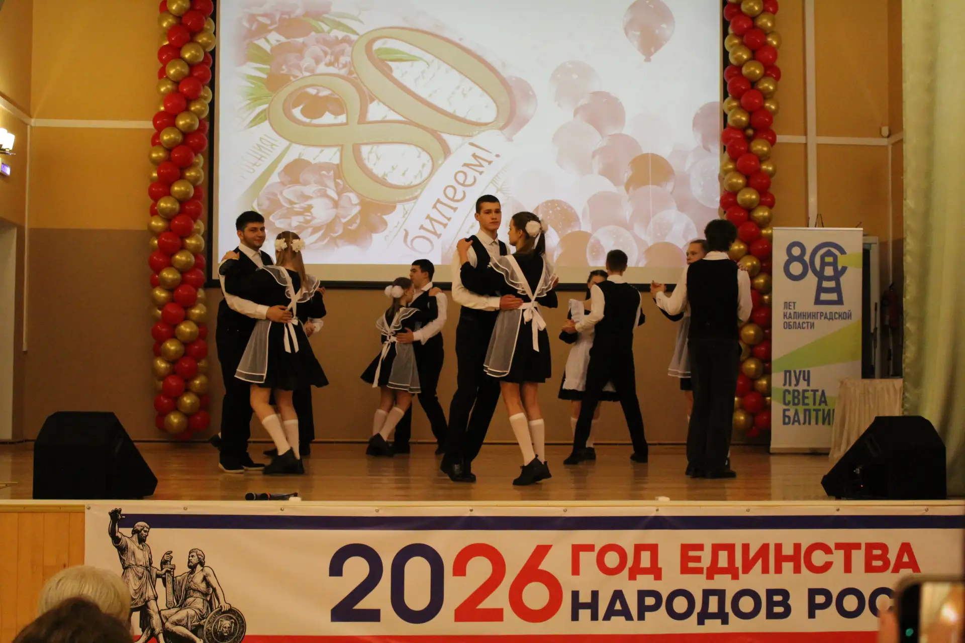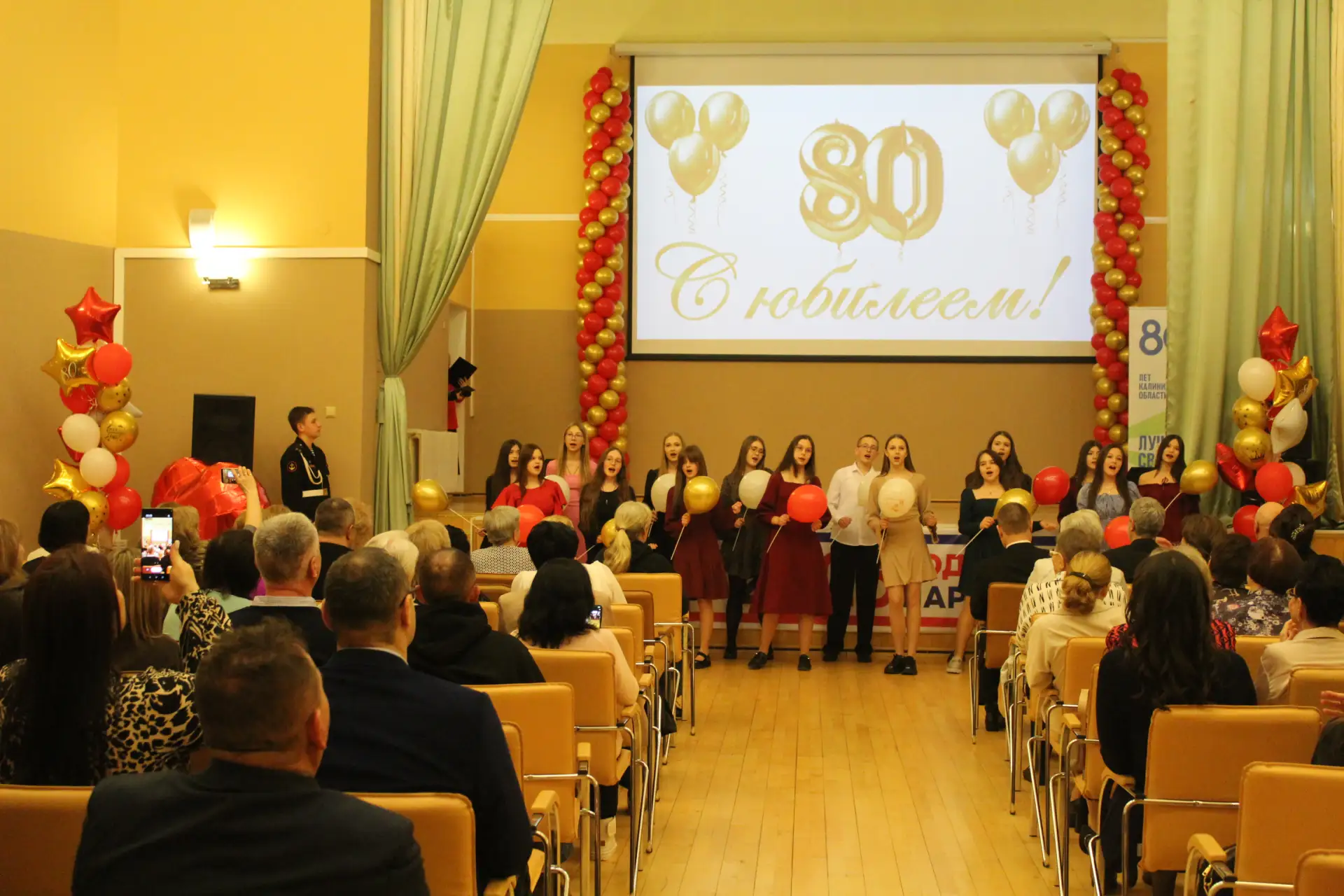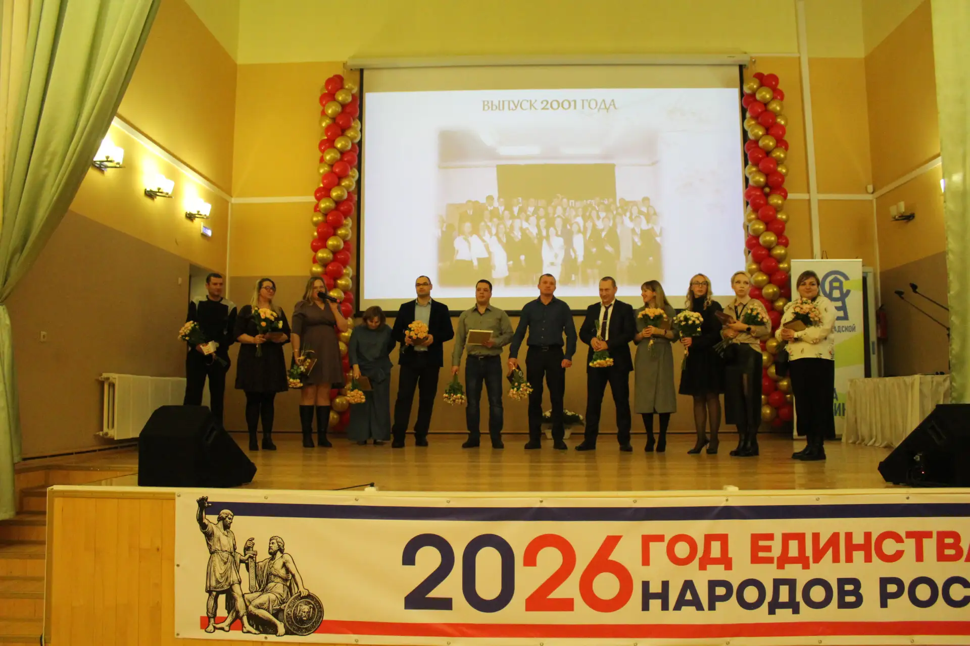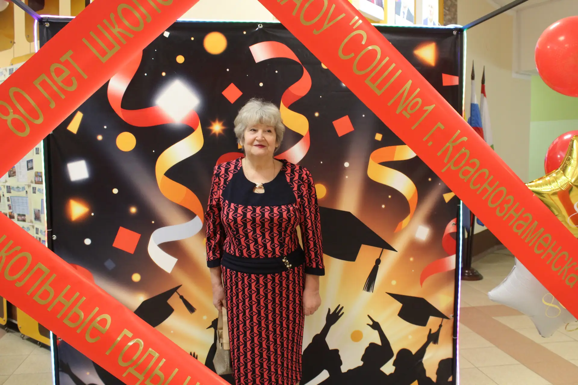 Актовый зал был наполнен улыбками и радостными возгласами узнавания. С приветственным словом к гостям и педагогам-ветеранам обратился глава Краснознаменского муниципального округа Макаров Виктор Георгиевич и Дмитрий Гариевич Чмыхов, депутат Законодательного Собрания Калининградской области. Также поздравить школу с юбилеем пришла председатель Общественного Совета Краснознаменского муниципального округа Ключникова Татьяна Семёновна. Она окончила нашу школу, работала в ней учителем математики и долгие годы руководила Отделом образования Краснознаменского района. И, находясь на этом посту, помогала строить новое здание нашей школы. С оригинальным подарком выступили выпускники 1991 года - 35 лет назад они окончили школу.