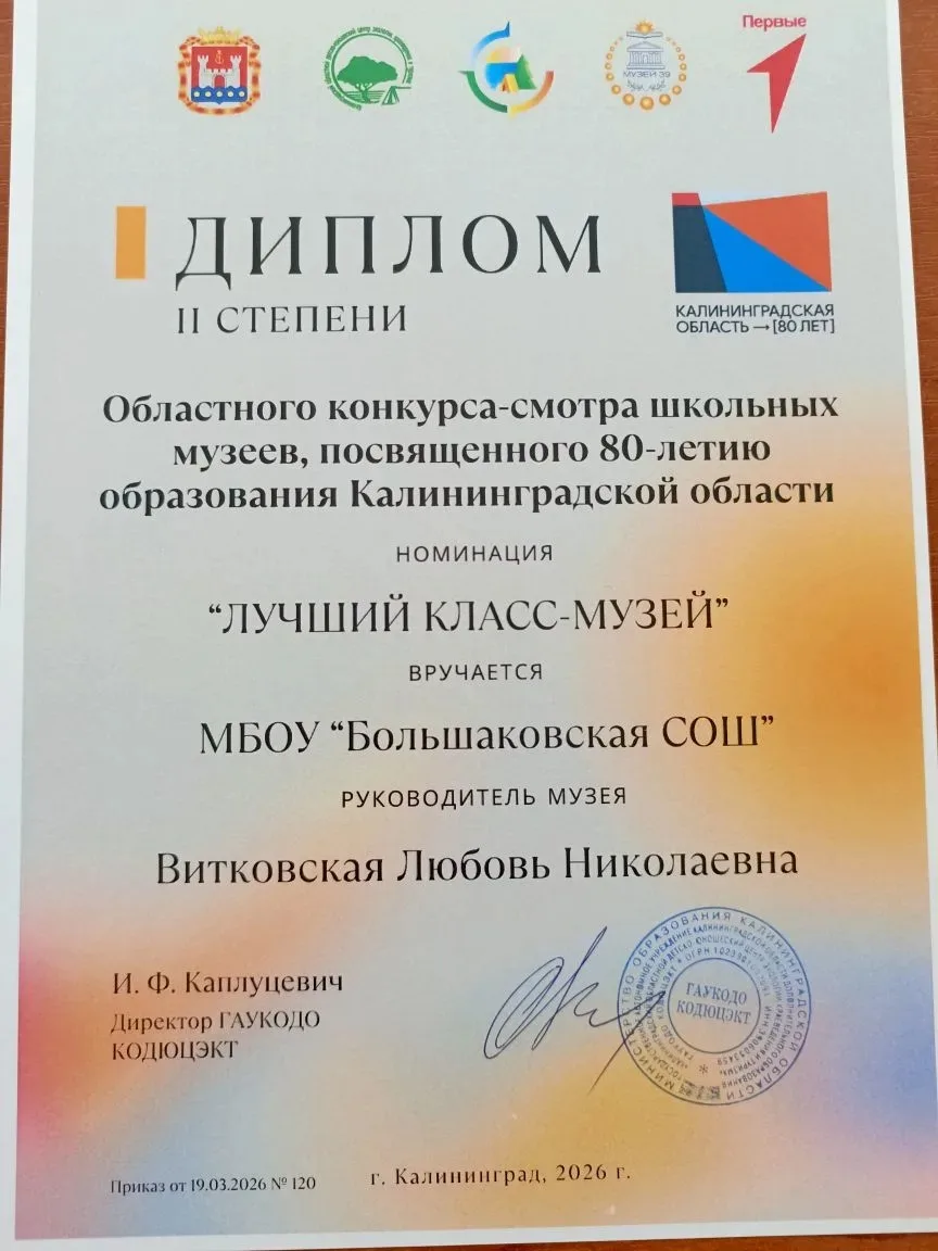💡Наш Музей «Родные истоки» занял второе место в номинации «Лучший класс-музей» Областного конкурса-смотра школьных музеев Калининградской области.