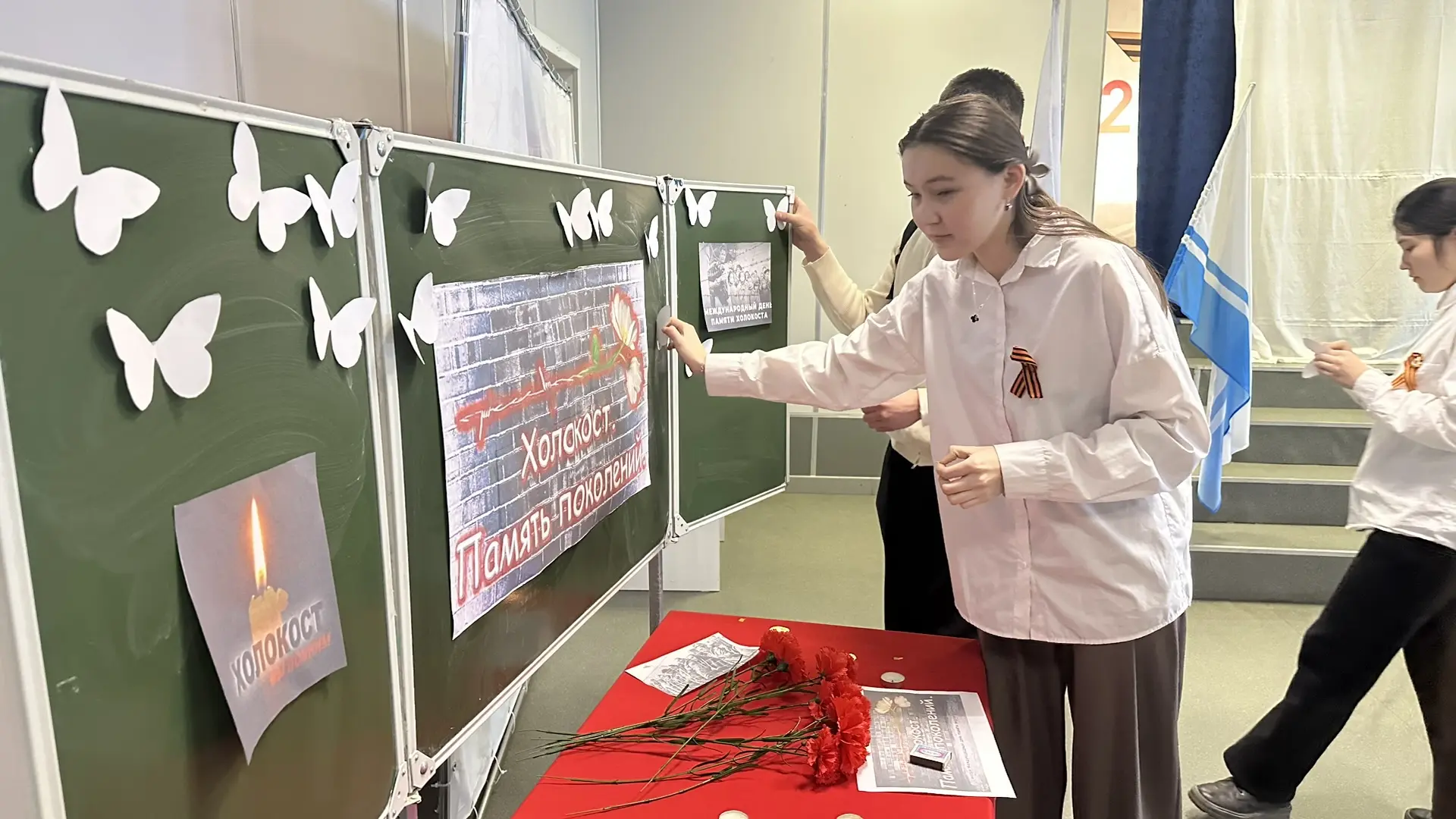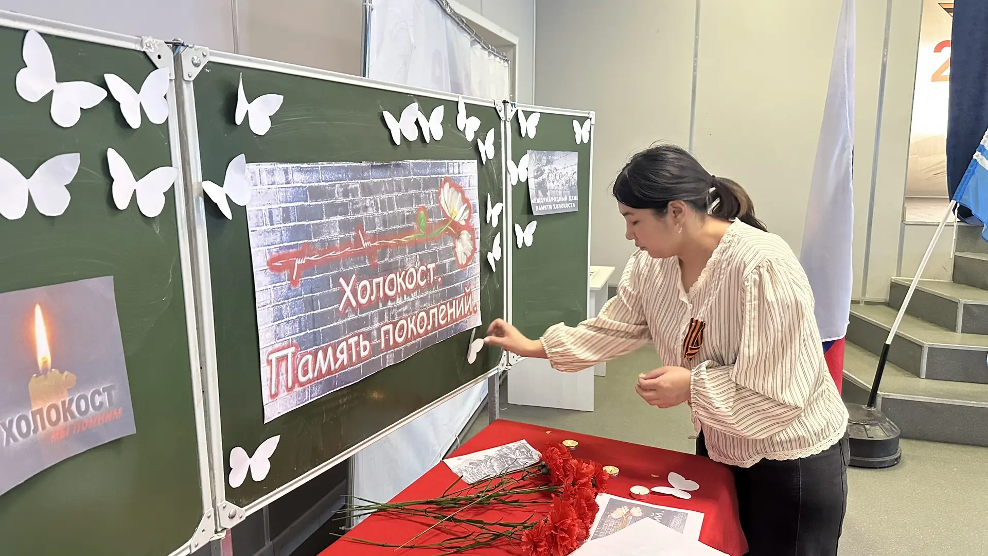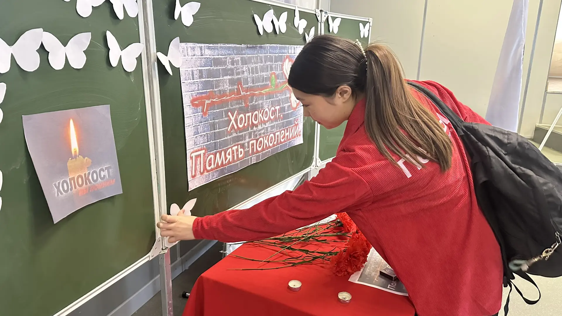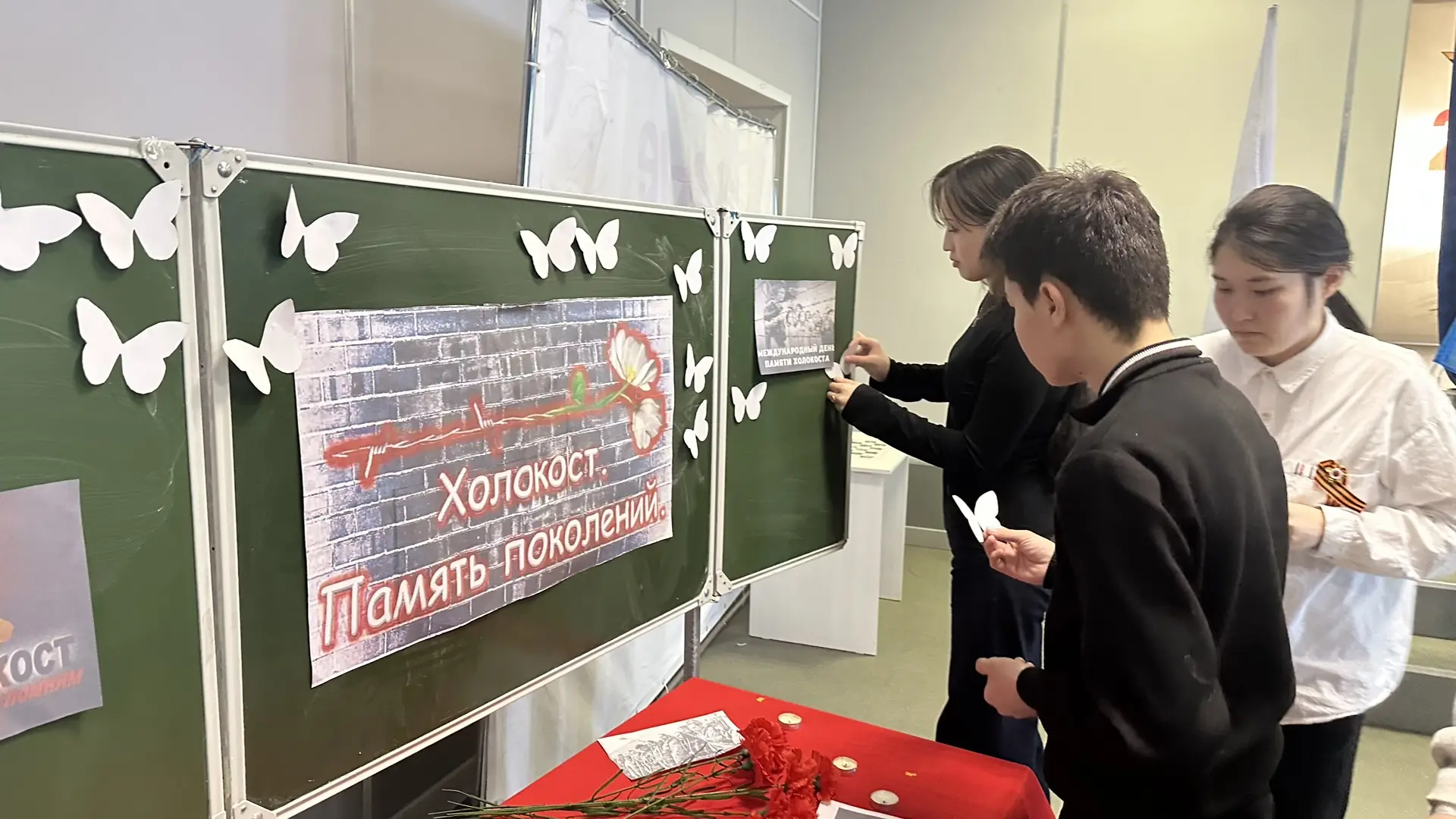 В память о погибших в концентрационных лагерях детях ребята и педагоги приготовили разноцветные красивые бабочки и собрали в единый коллаж в форме большой бабочки.