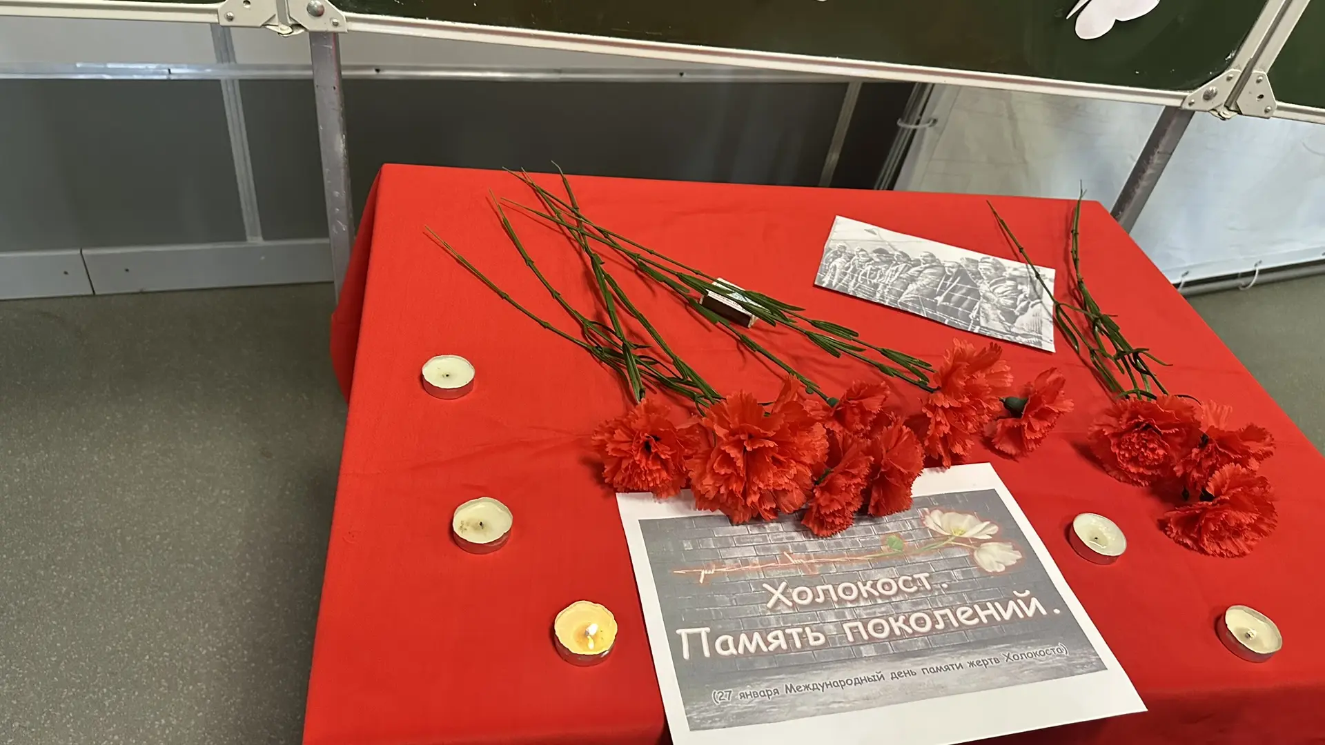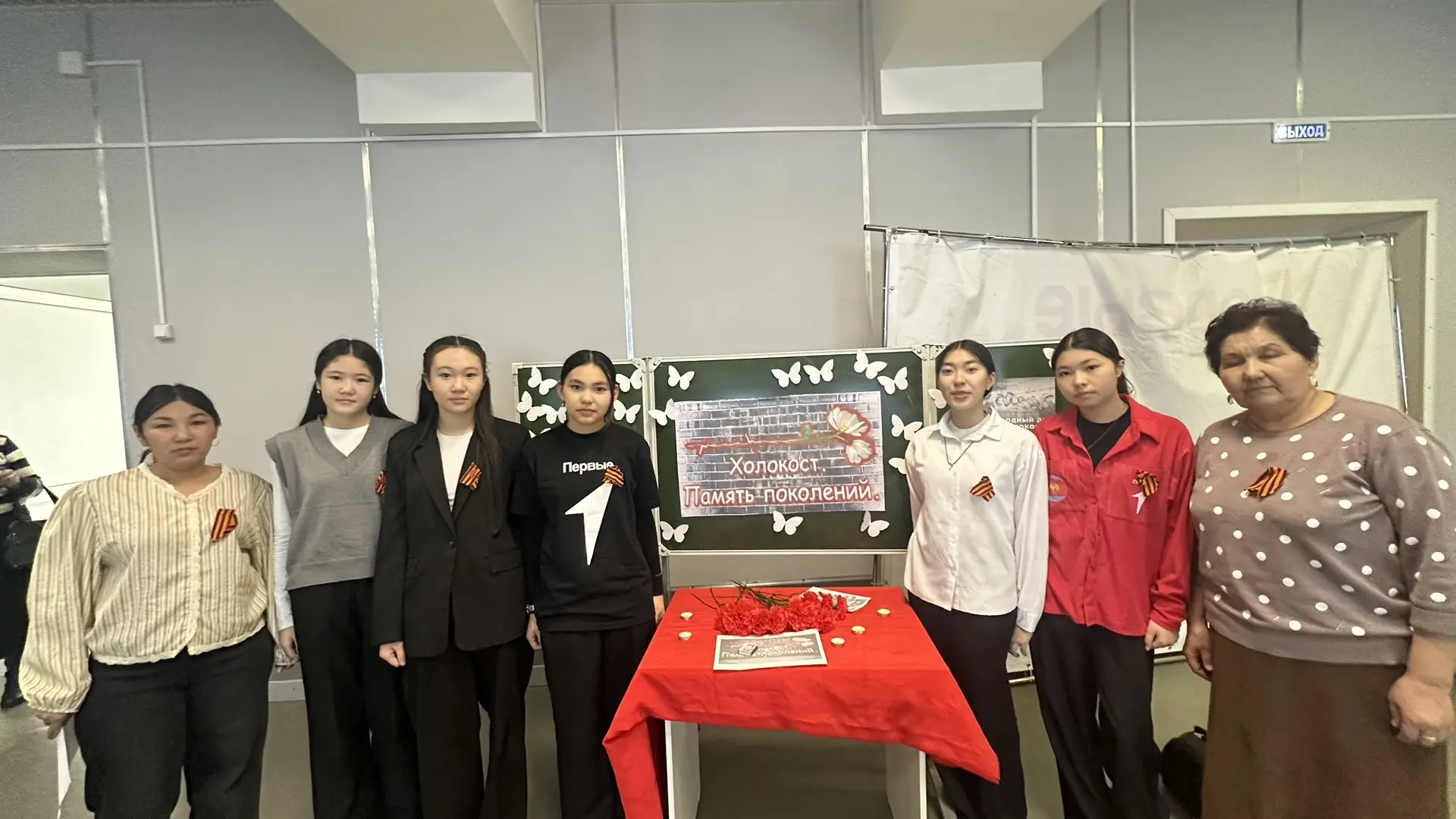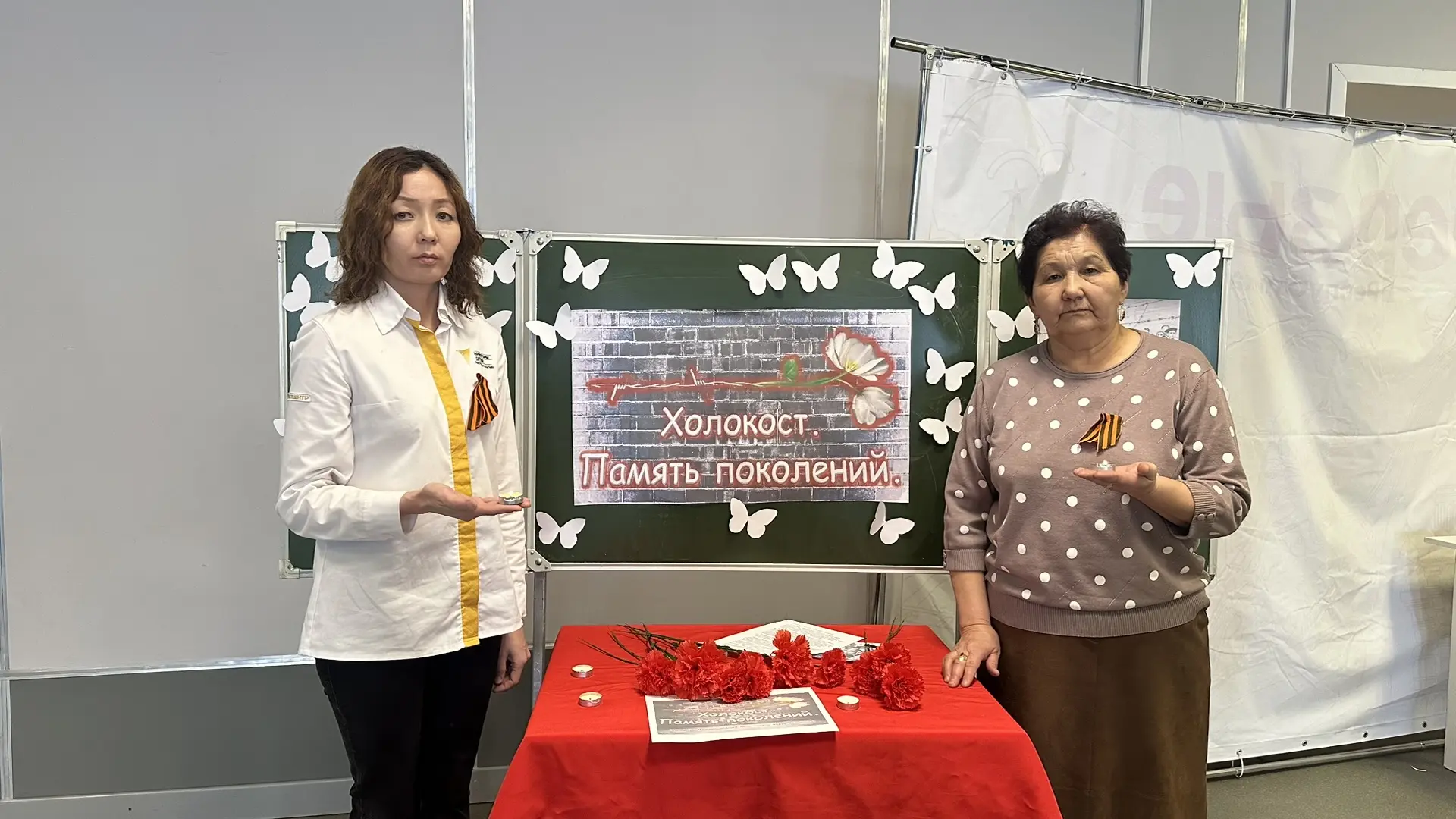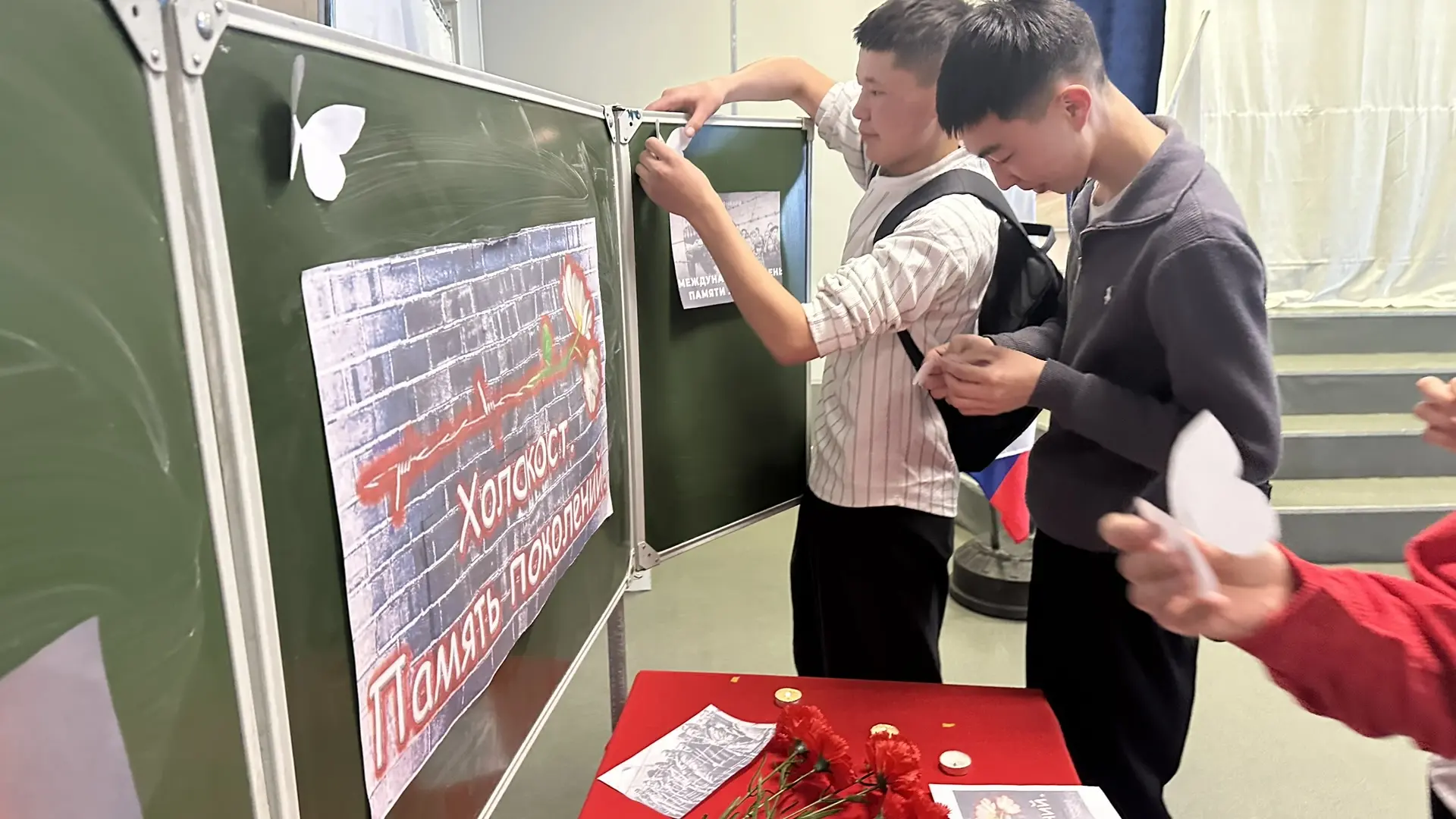 В память о погибших в концентрационных лагерях детях ребята и педагоги приготовили разноцветные красивые бабочки и собрали в единый коллаж в форме большой бабочки.