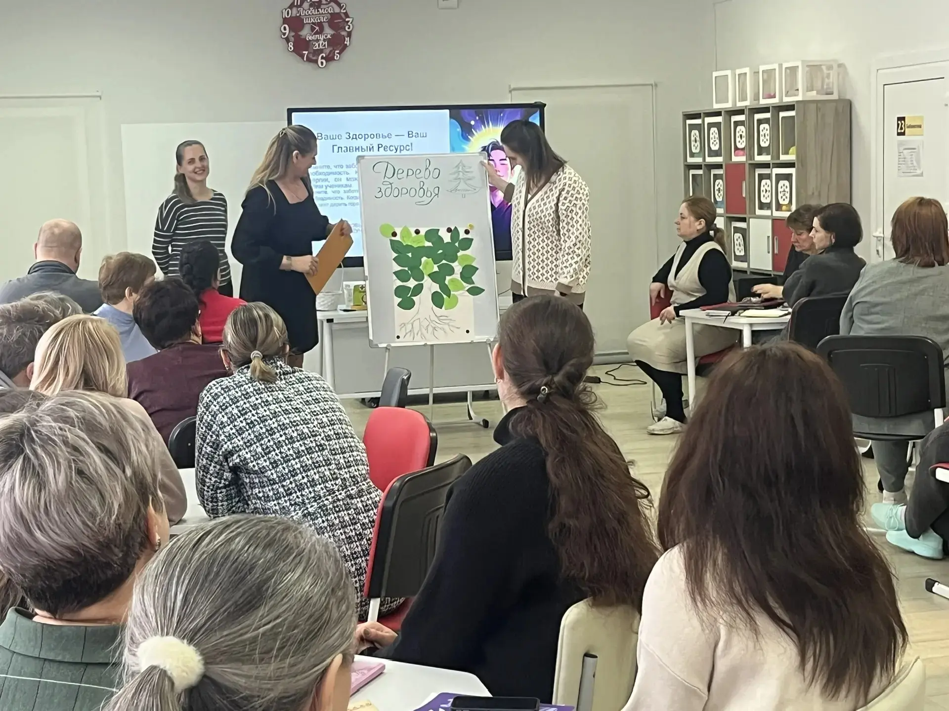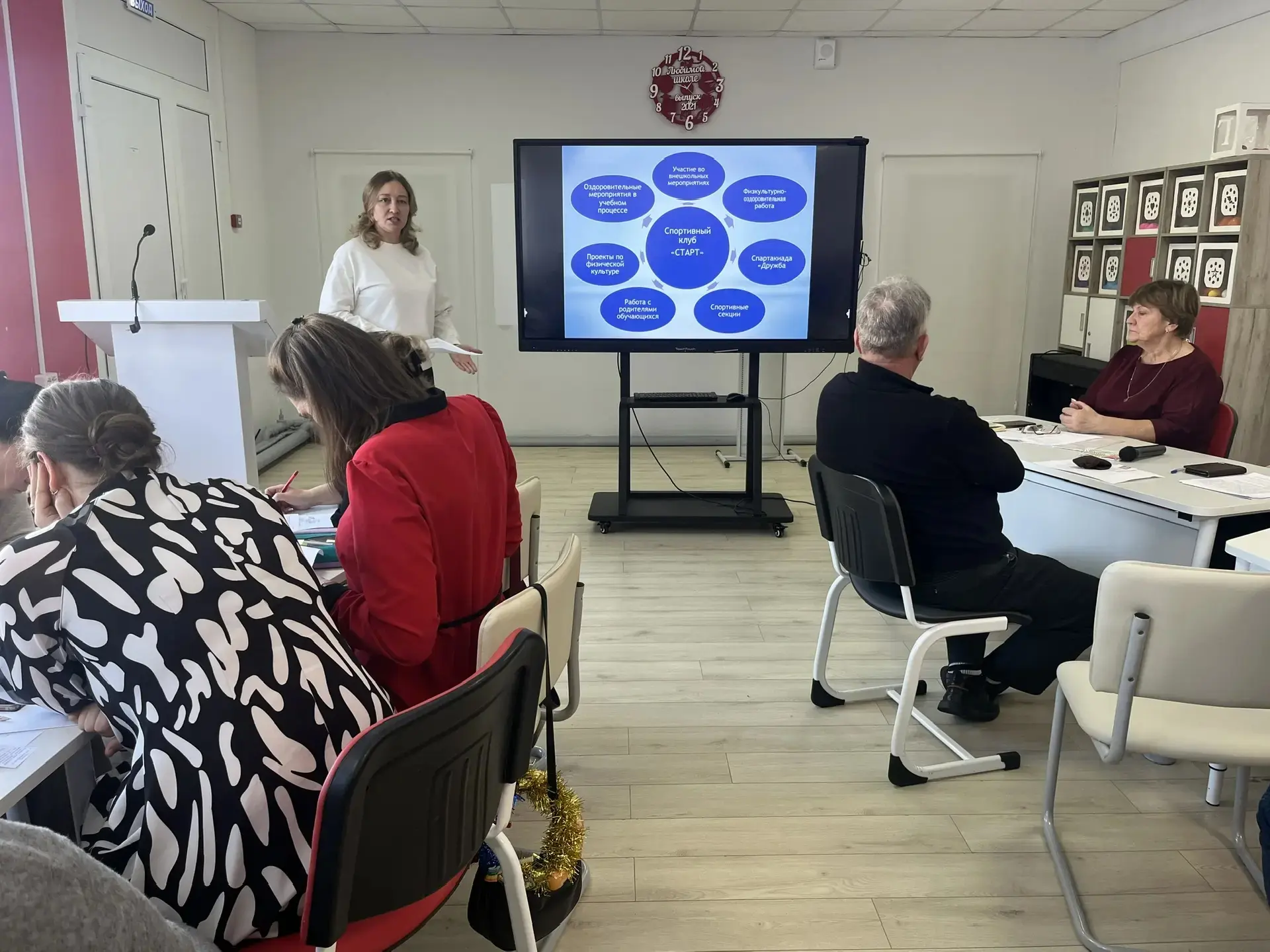 В ходе педсовета учителя не только слушали выступления коллег, но и учились полезным практикам по сохранению и поддержанию личного здоровья. Приятные методические эмоциональные сюрпризы подарили участники Школы вдохновения.