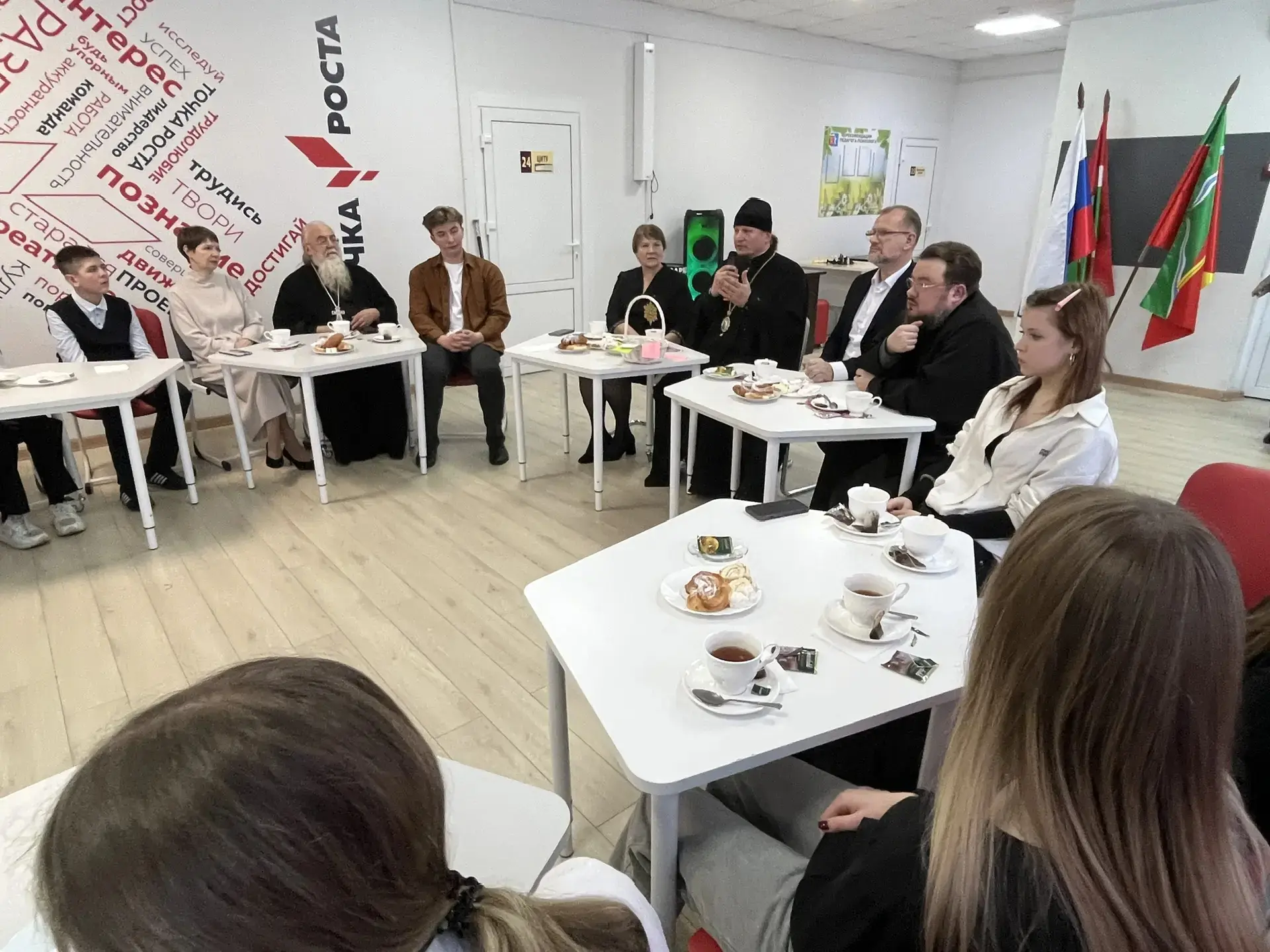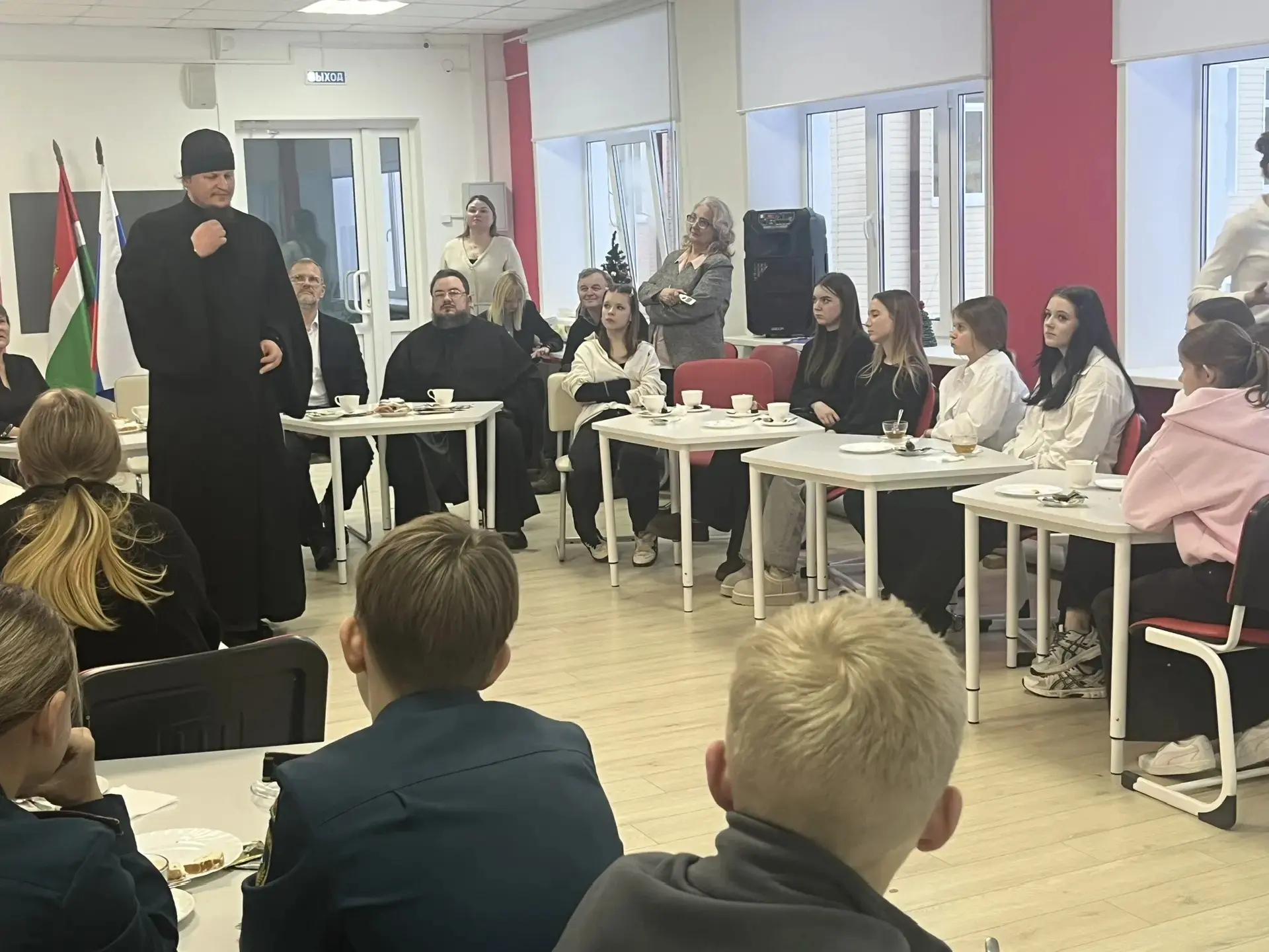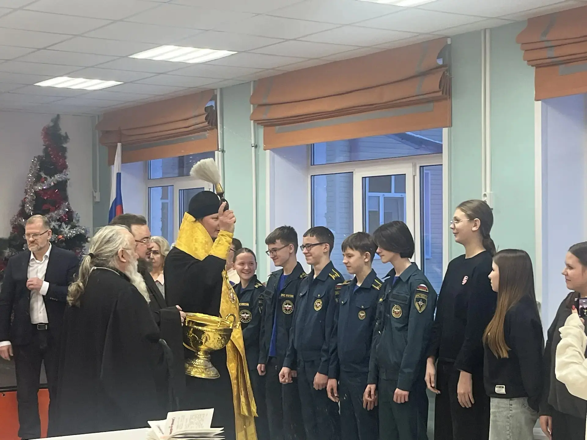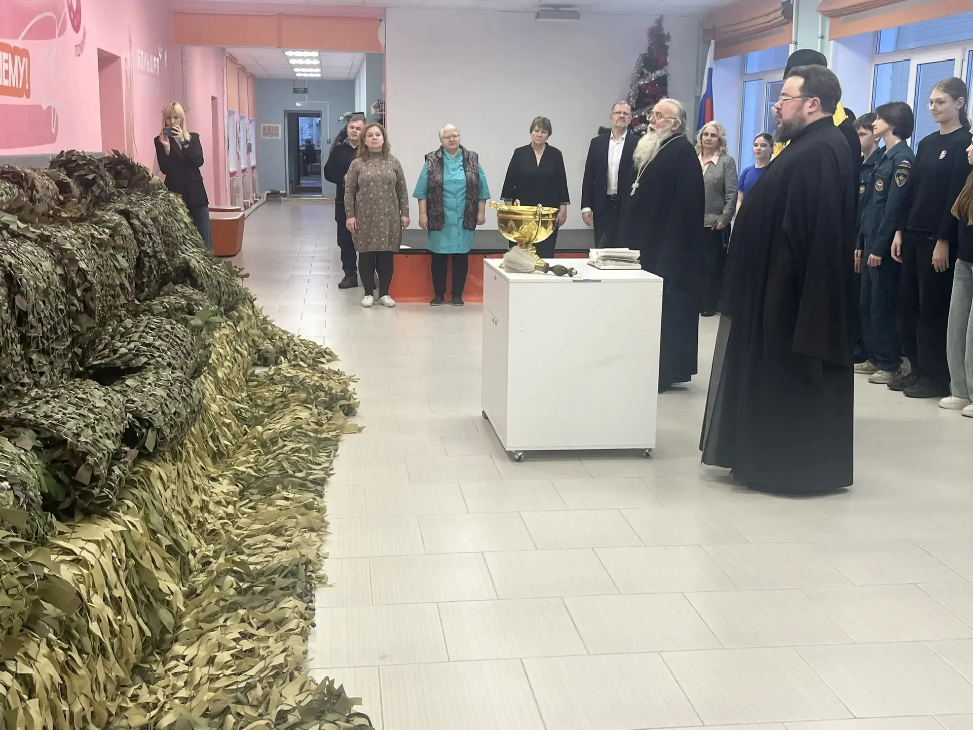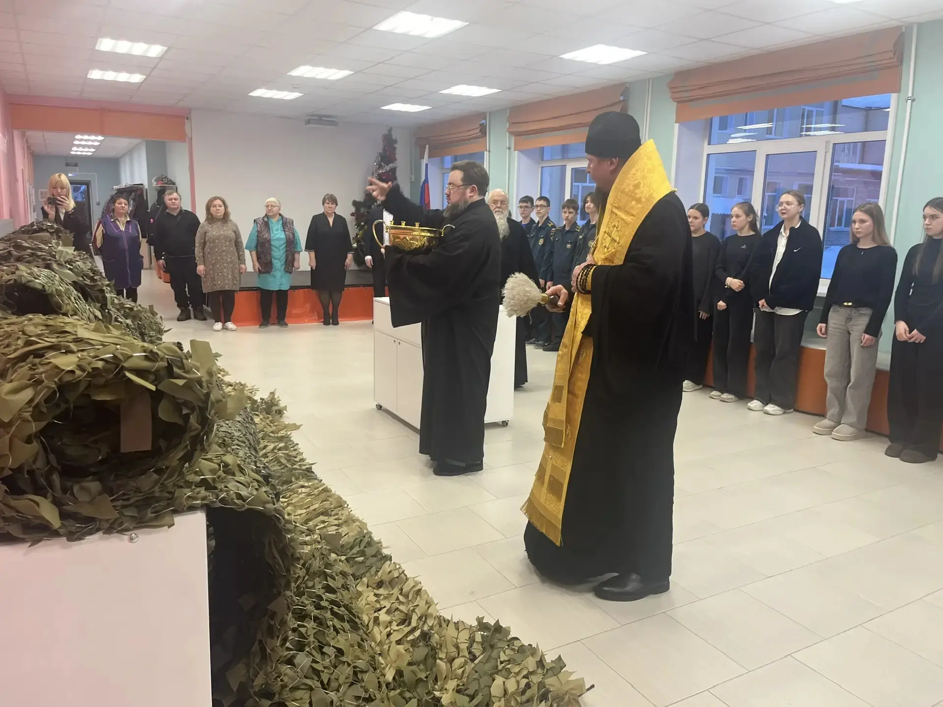 В первый учебный день ученики и гости школы встретились с Епископом Козельским и Людиновским Макарием. Встреча была организована по инициативе Владыки Макария, поддержана администрацией округа, благочинным и администрацией школы. В ходе встречи ребята и гости узнали о впечатлениях и особенных моментах жизни Владыки, получили от гостей ответы на волнующие вопросы, связанные с духовной жизнью человека в разном возрасте. Встреча закончилась совершением чина освящения маскировочных сетей, которые в течение двух месяцев плели сотрудники школы, педагоги, родители и дети.