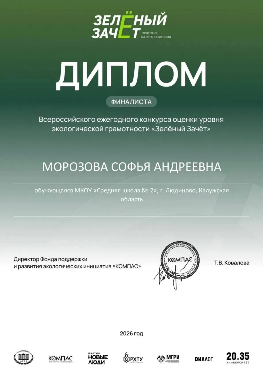 26 февраля 2026 года в столице России прошёл финал Всероссийского конкурса «Зелёный Зачёт». Участницами стали Софья Морозова и Ксения Артюкова. В рамках конкурса они продемонстрировали свои знания в области географии, биологии, химии, физики и геофизики, отвечая на вопросы и решая практические задачи. Это событие стало для них значимым опытом участия в соревнованиях столь высокого уровня.